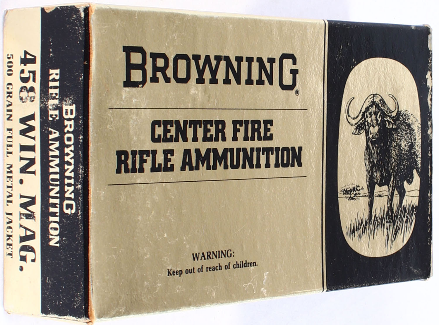 Browning, .458 Win. Mag., 500 Grain FMJ, Full, 1pc., Multi-colored box, box is very solid with light rub marks, ammo is very good. Grade: Excellent - Value: 50 to 150