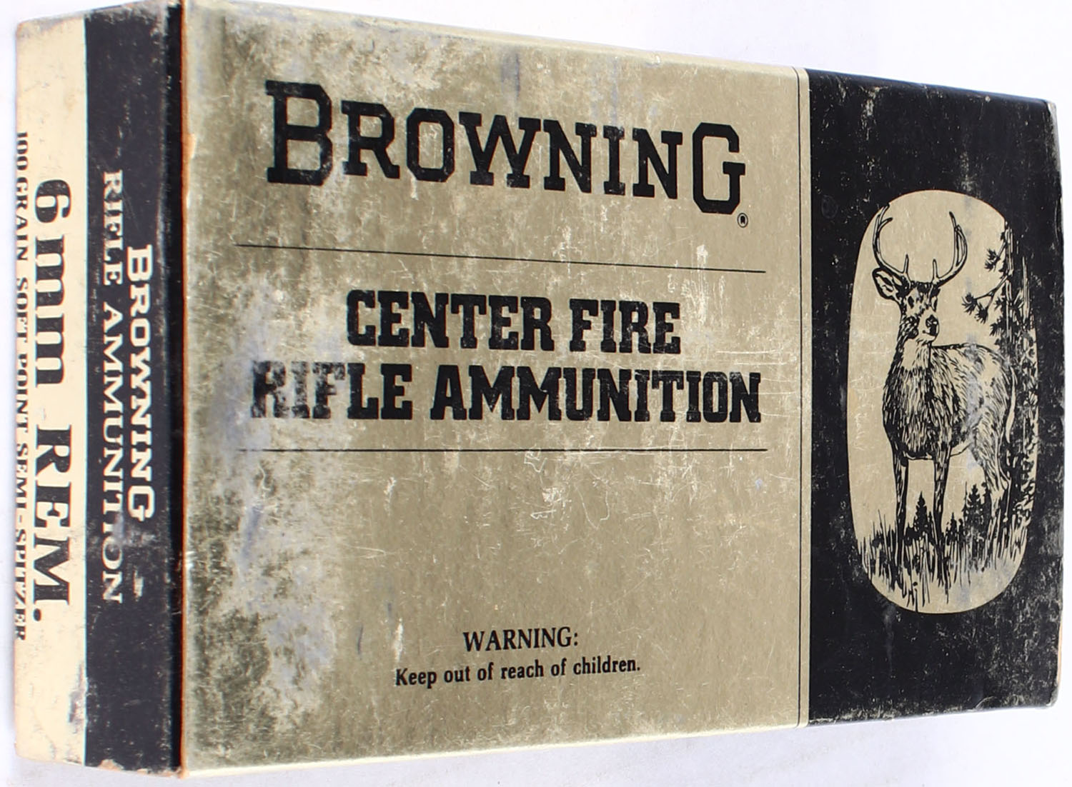 Browning, 6 mm Rem., 100 Grain Soft Point Spitzer, Has Insert, Full, 1pc., multi-colored box, box has scuffing with shelf wear, Ammo is very good. Grade: Very Good - Value: 20 to 50