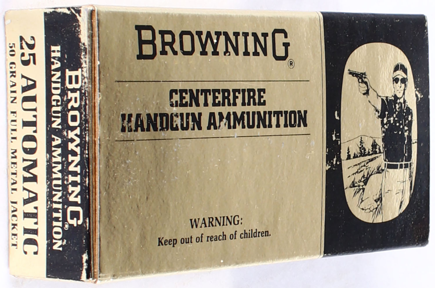 Browning, .25 Auto., 50 Grain FMJ, Full, 1pc., Multi-colored box, box is very solid with minor shelf wear, ammo is excellent. Grade: Excellent - Value: 20 to 30