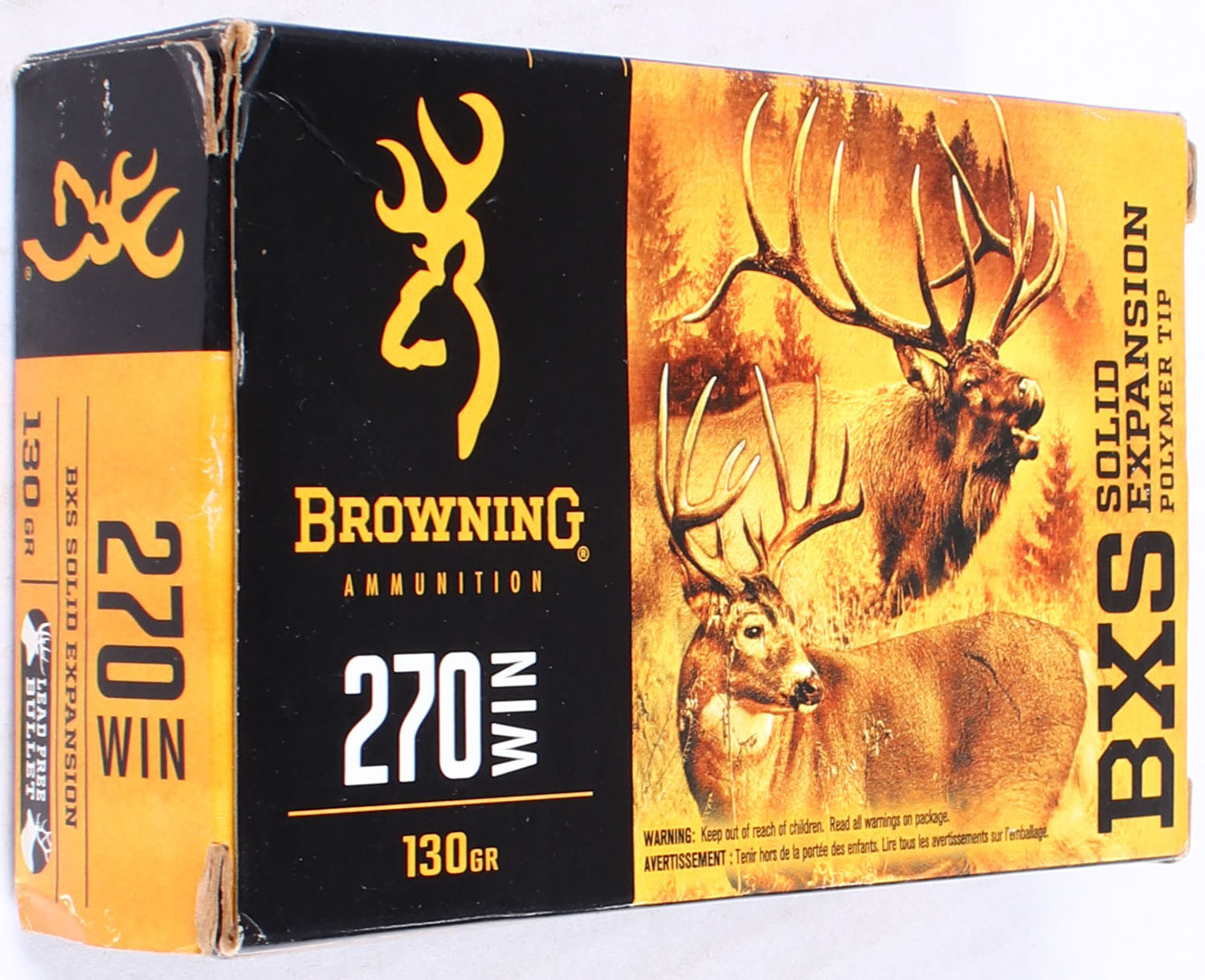 Browning, .270 Win., 130 Grain, BXS Solid Expansion, Full, 1pc., Multi-colored box, box is solid with light corner wear, ammo is excellent. Grade: Very Good ++ - Value: 20 to 30