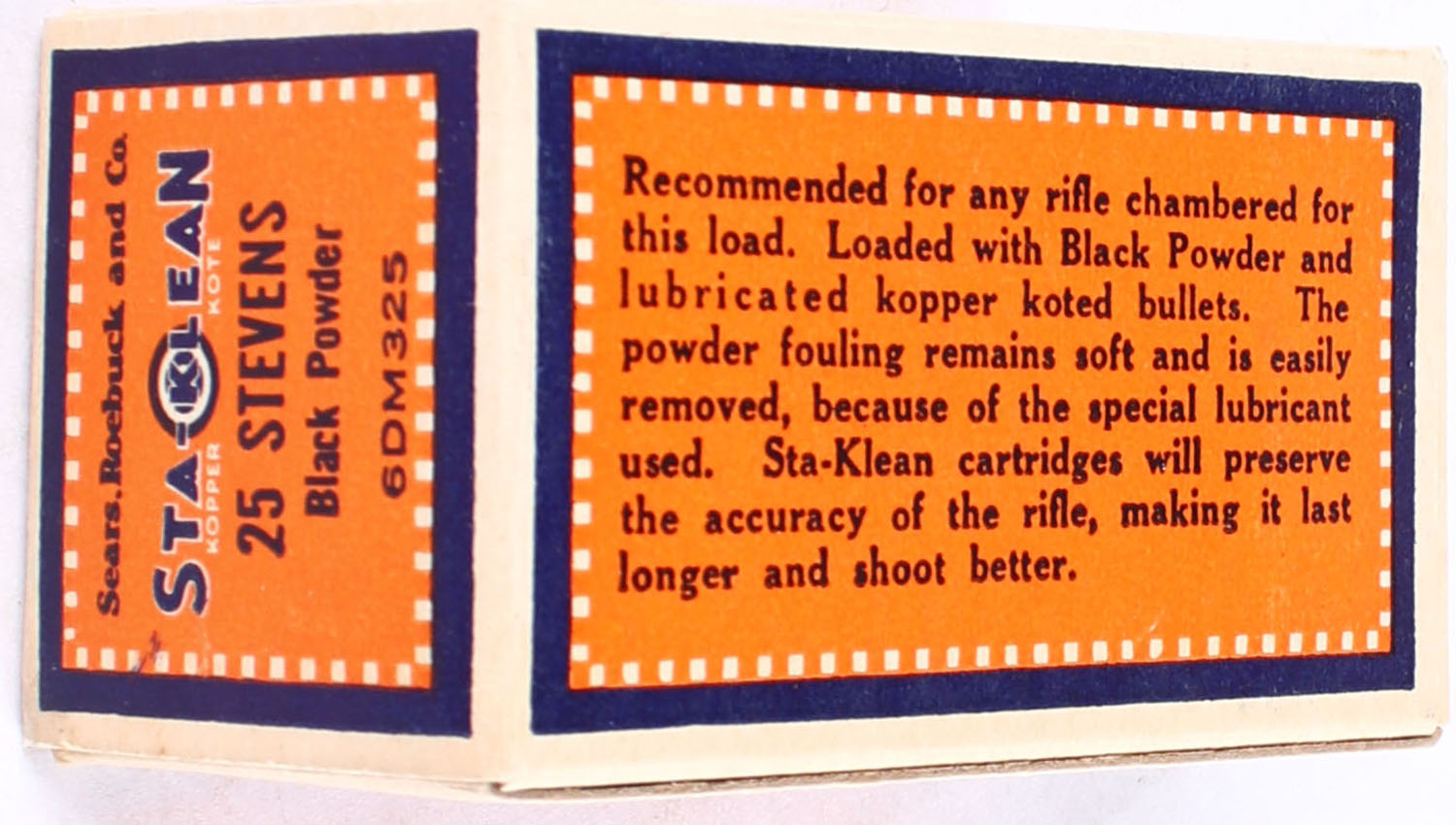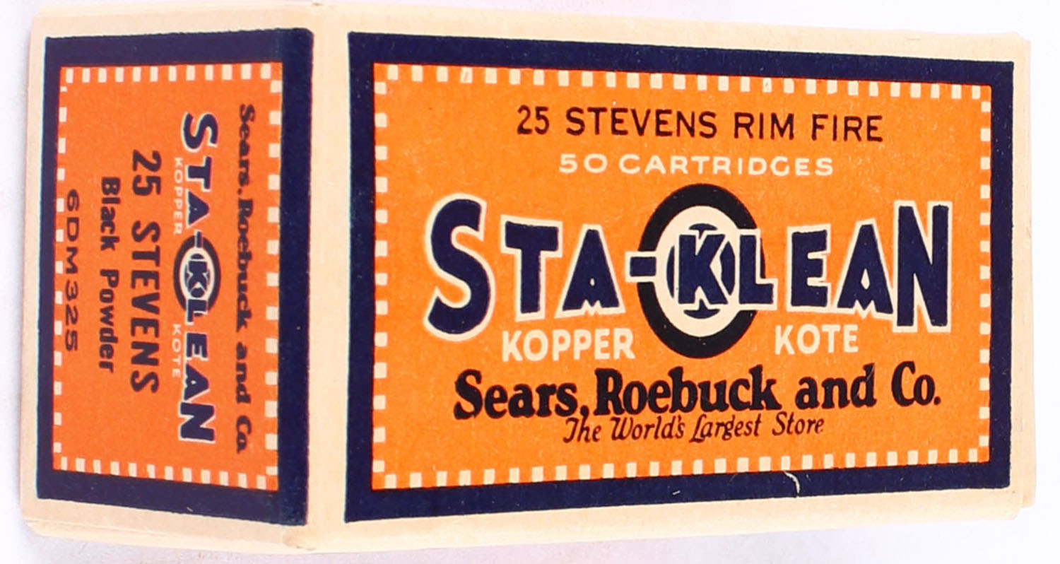 Sears, Roebuck and Co., 25 Stevens Rim Fire, Black Powder, Full, 1pc., Multi-colored box, box is very solid, ammo is mint. Grade: MINT - Value: 80 to 120