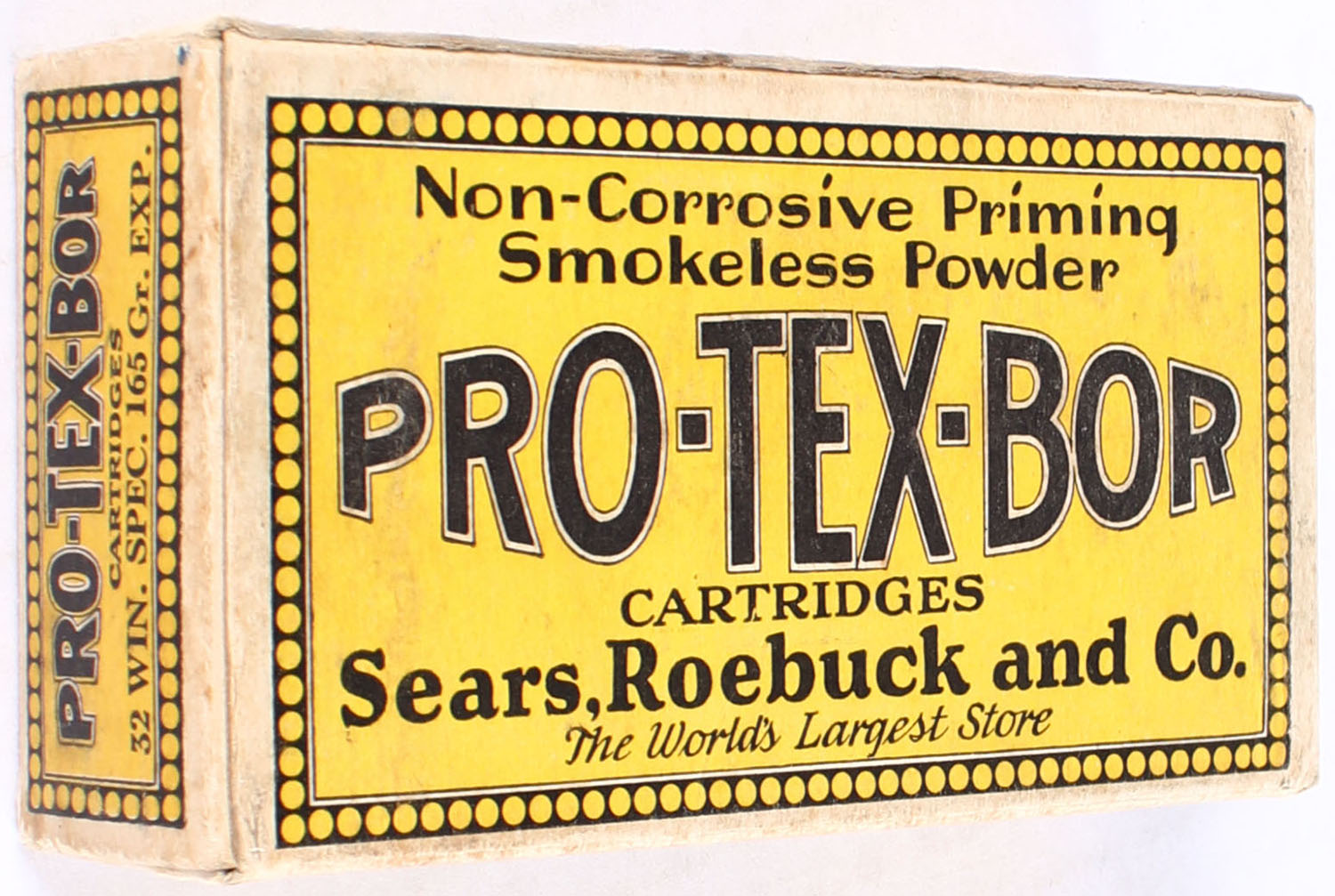 Sears, Pro-Tex-Bor, .32 Win. Special, 165 Grain Expanding, Full, 1pc., Multi-color box, box is solid with excellent color, ammo is excellent. Grade: Very Good ++ - Value: 24 to 40