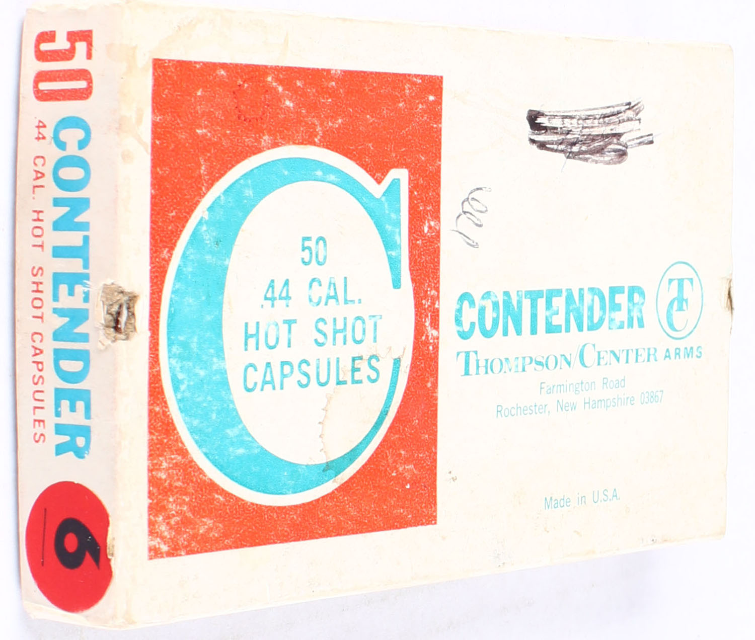 Thompson Center Arms, Contender, .44 Hot Shot Capsules, 2pc, Full, multi-colored box, box is solid with light scuffing, ammo is very good. Grade: Very Good - Value: 16 to 24