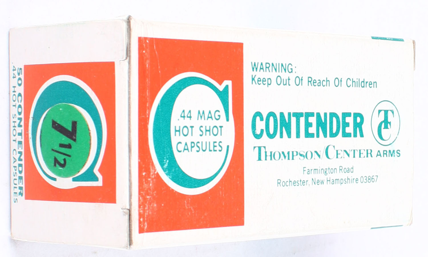 Thompson Center Arms, Contender, .44 Hot Shot Capsules, 1pc, Full, multi-colored box, box is very solid, end flaps are solid, ammo is good. Grade: Excellent - Value: 10 to 30
