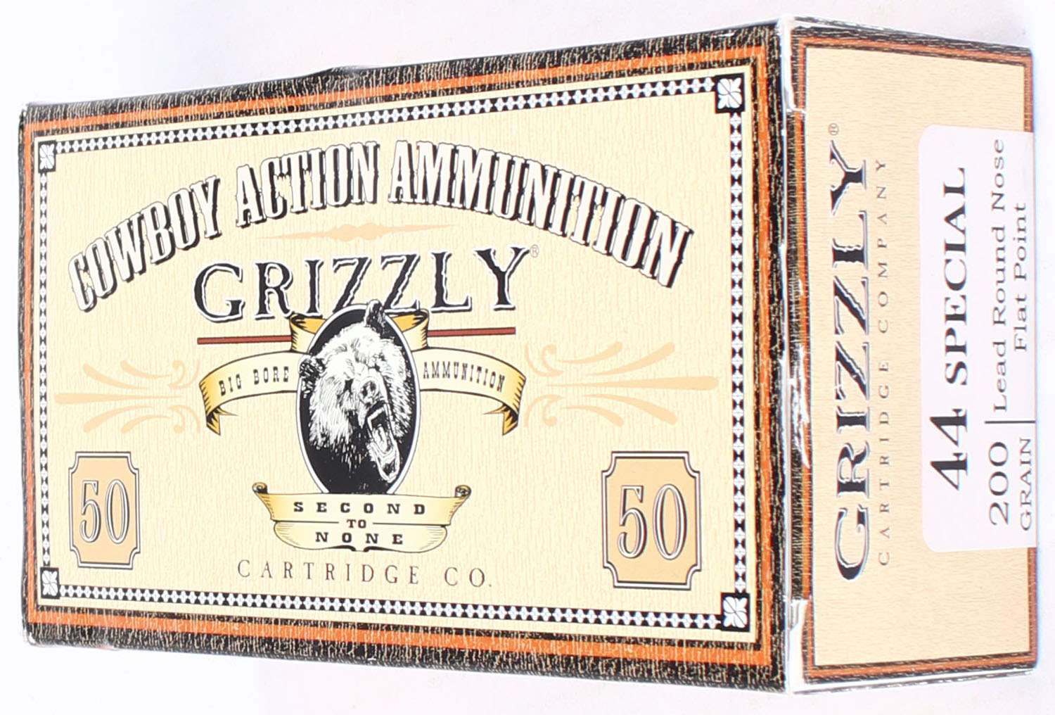 Grizzly Cartridge, Cowboy Action Ammo, .44 Special, 200 Grain LRN FP, Full, 1pc., Multi-colored box, box is solid with excellent color, ammo is excellent. Grade: Excellent + - Value: 30 to 45