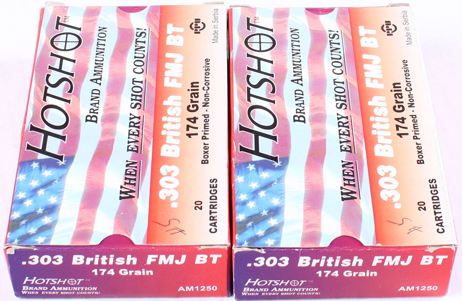 Hotshot, .303 British FMJ BT, 174 Grain, Full, 1pc., Multi-colored boxes, boxes are solid, ammo is mint. Grade: Excellent + - Value: 30 to 45