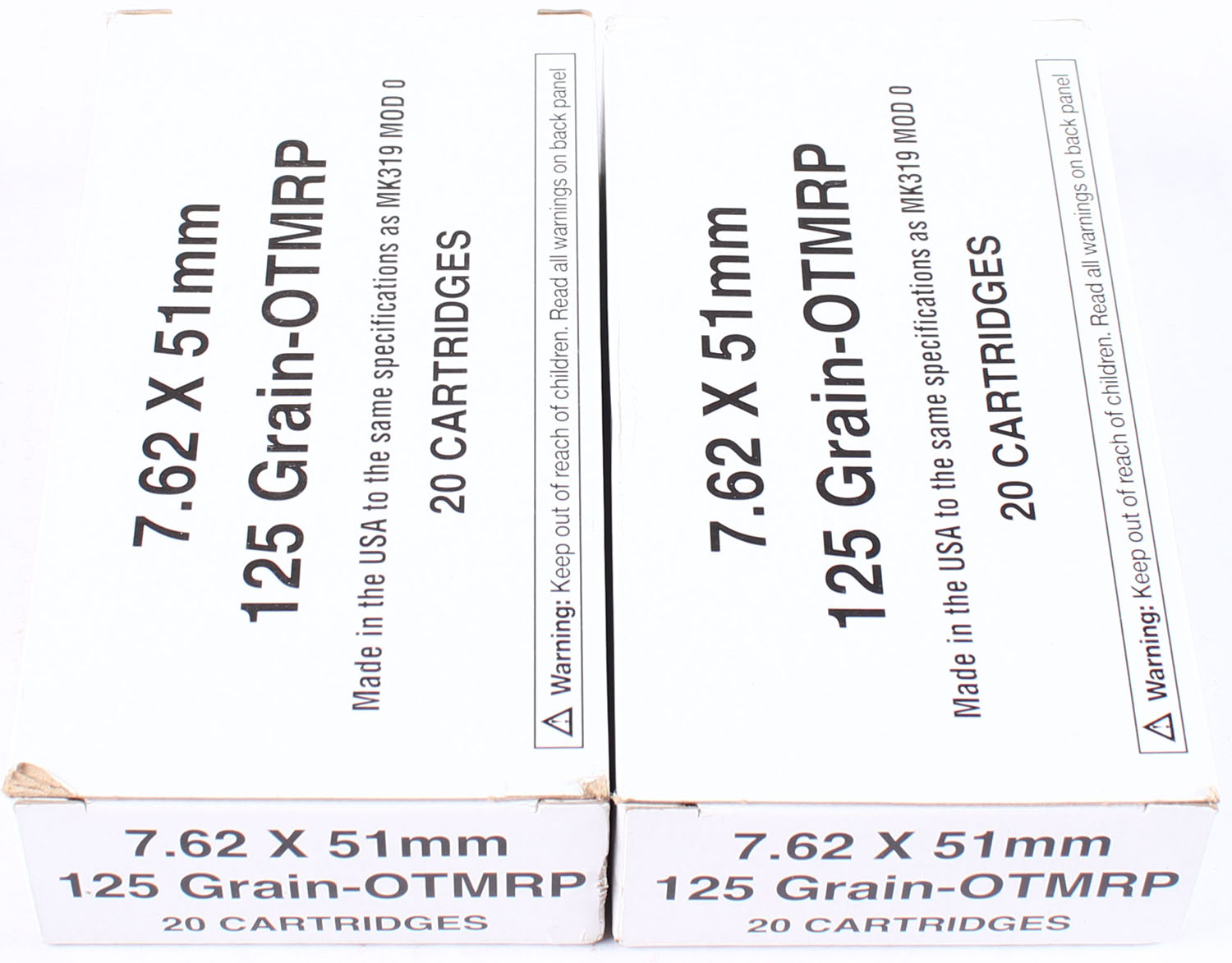 Unknown Mfg., Lot of (2) 7.62 x 51mm, 125 Grain OTMRP, Full, 1pc., white boxes with black print, boxes are very solid, ammo is very good. Grade: Excellent - Value: 20 to 30
