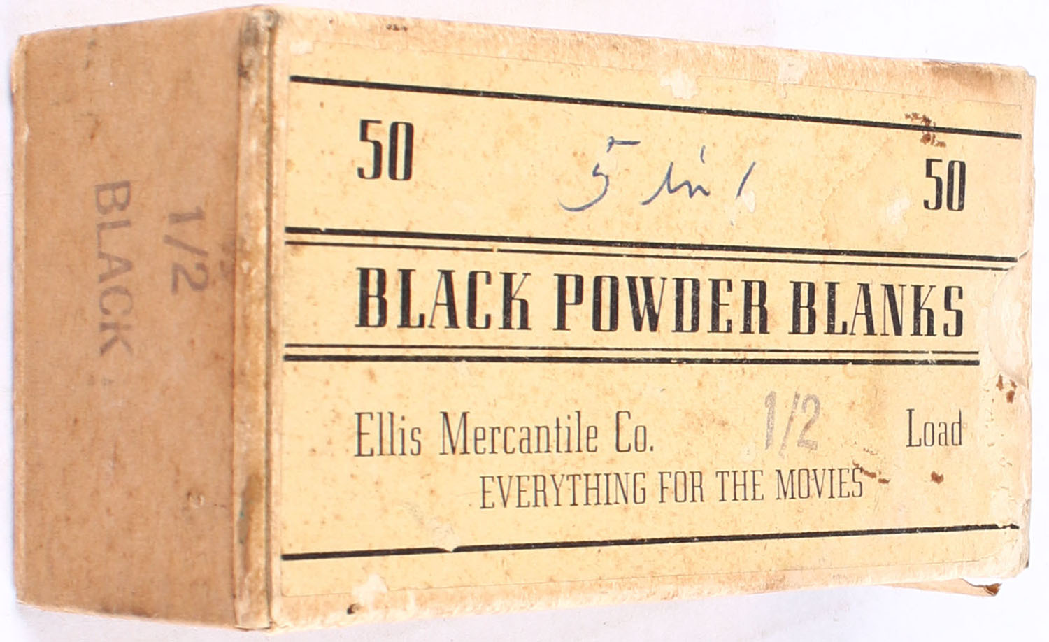 Ellis Mercantile Co., Black Powder Blanks, 5 in 1, Partial 44rds., 1pc., buff box with black print, box has scuffing with age wear, ammo is very good. Grade: Very Good - Value: 10 to 40