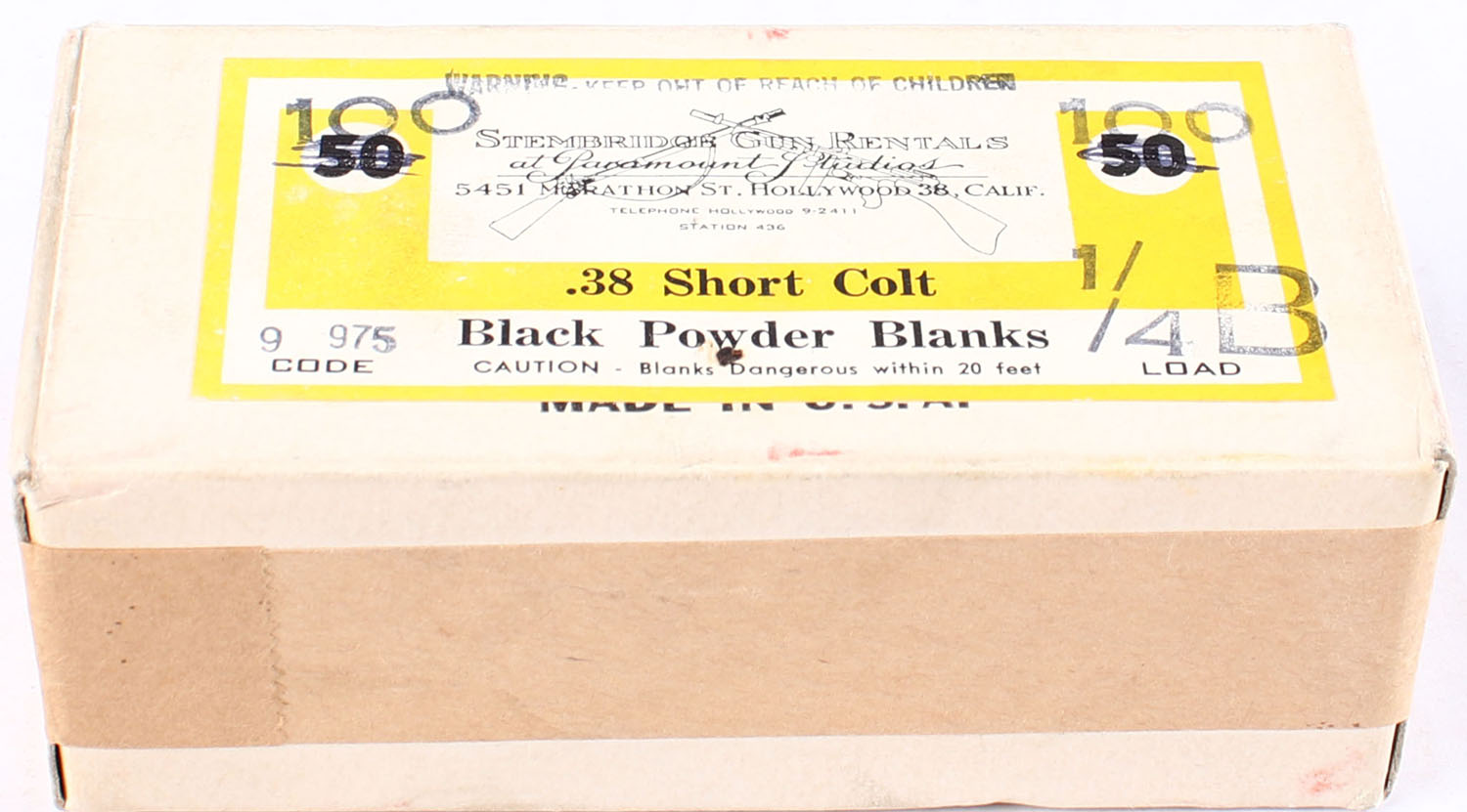 Stembridge Gun Rentals Inc., .38 Short Colt, Black Powder Blanks, Flash Powder Blanks from the famous Hollywood gun rental company, FULL & SEALED, 1pc., multi-colored box, Box is very solid, ammo is excellent. Grade: Excellent + - Value: 40 to 60