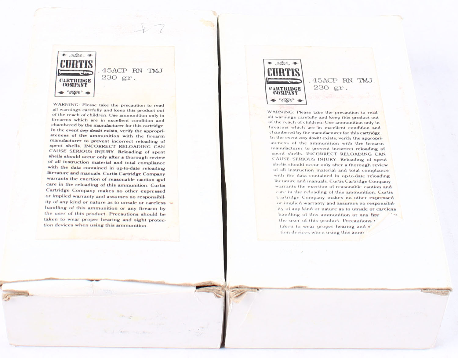 Curtis Cartridge Company, Lot of (2) .45 ACP, 230 Grain TMJ., Full, 1pc., White box with label, box has light scuffing, ammo is very good. Grade: Very Good - Value: 24 to 36