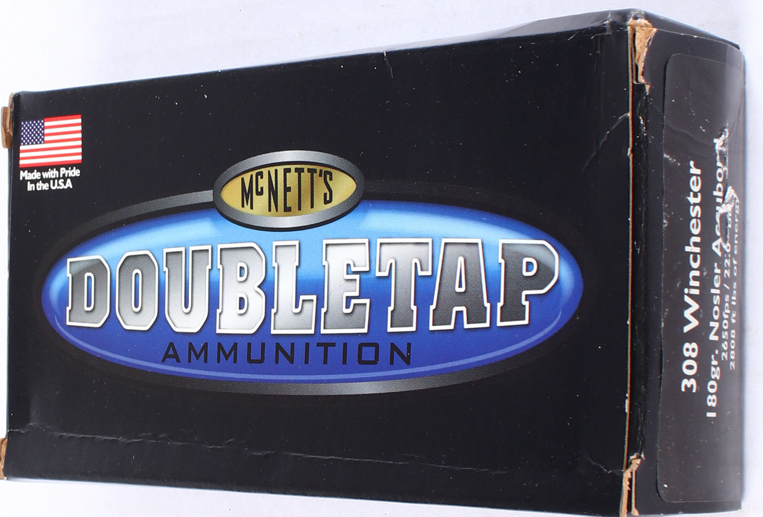 McNett's, Double Tap Ammunition, .308 Winchester, 180 Grain Nosler Accubond, Full, 1pc. Multi-colored box, box is very solid, end flaps are solid, edges are crisp, ammo is very good. Grade: Excellent - Value: 16 to 24