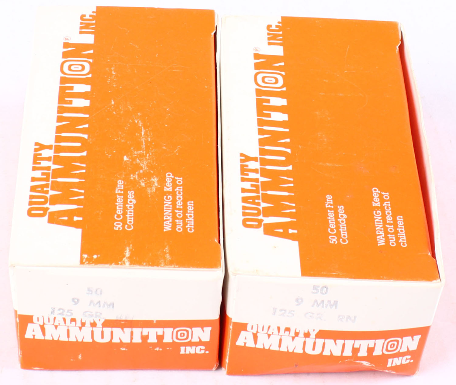 Quality Ammunition, Lot of (2), 9mm. 125 Grain RN, (1) box is Full, (1) box is partial, 1pc., Orange & white boxes, boxes are solid, ammo is good. Grade: Very Good ++ - Value: 10 to 20