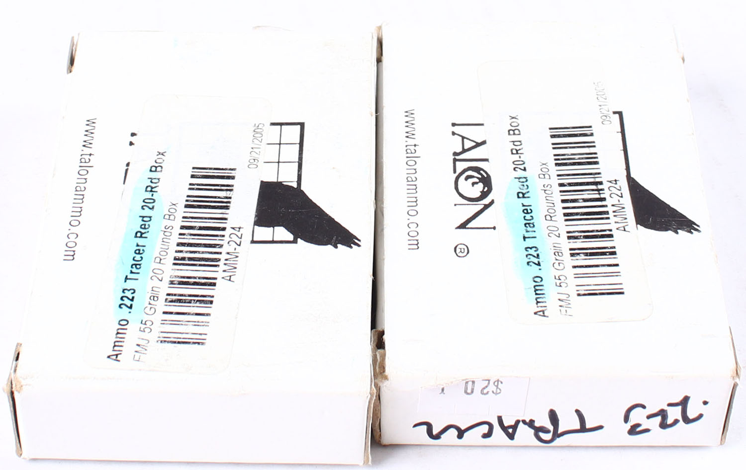 Talon Manufacturing, Lot of (2), .223 Tracer, 55 Grain FMJ, White boxes with black print, boxes are solid, ammo is excellent. Grade: Very Good - Value: 14 to 21