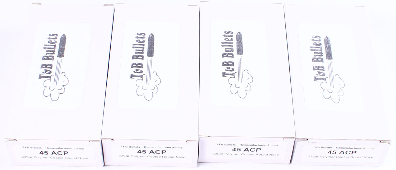 T&B Bullets, Lot of (4) .45 ACP ammo boxes, Remanufactured Ammo by a class type 7 Ammo MFG (this is the same class (high quality) as Winchester, Federal and or CCI), 230 Grain Polymer Coated Round nose bullet, loaded cartridges, Full, 1pc, white boxes with black print, boxes are very solid, ammo is excellent. Grade: Excellent - Value: 30 to 60