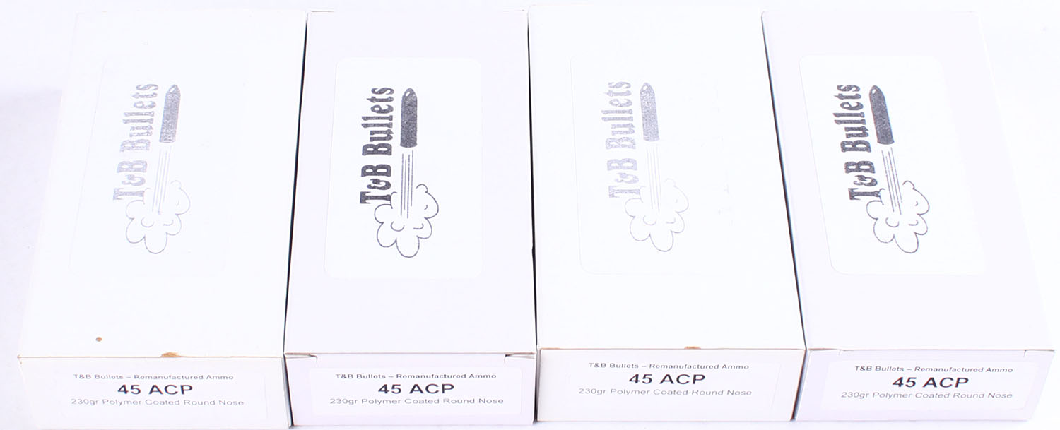 T&B Bullets, Lot of (4) .45 ACP ammo boxes, Remanufactured Ammo by a class type 7 Ammo MFG (this is the same class (high quality) as Winchester, Federal and or CCI), 230 Grain Polymer Coated Round nose bullet, loaded cartridges, Full, 1pc, white boxes with black print, boxes are very solid, ammo is excellent. Grade: Excellent - Value: 30 to 60