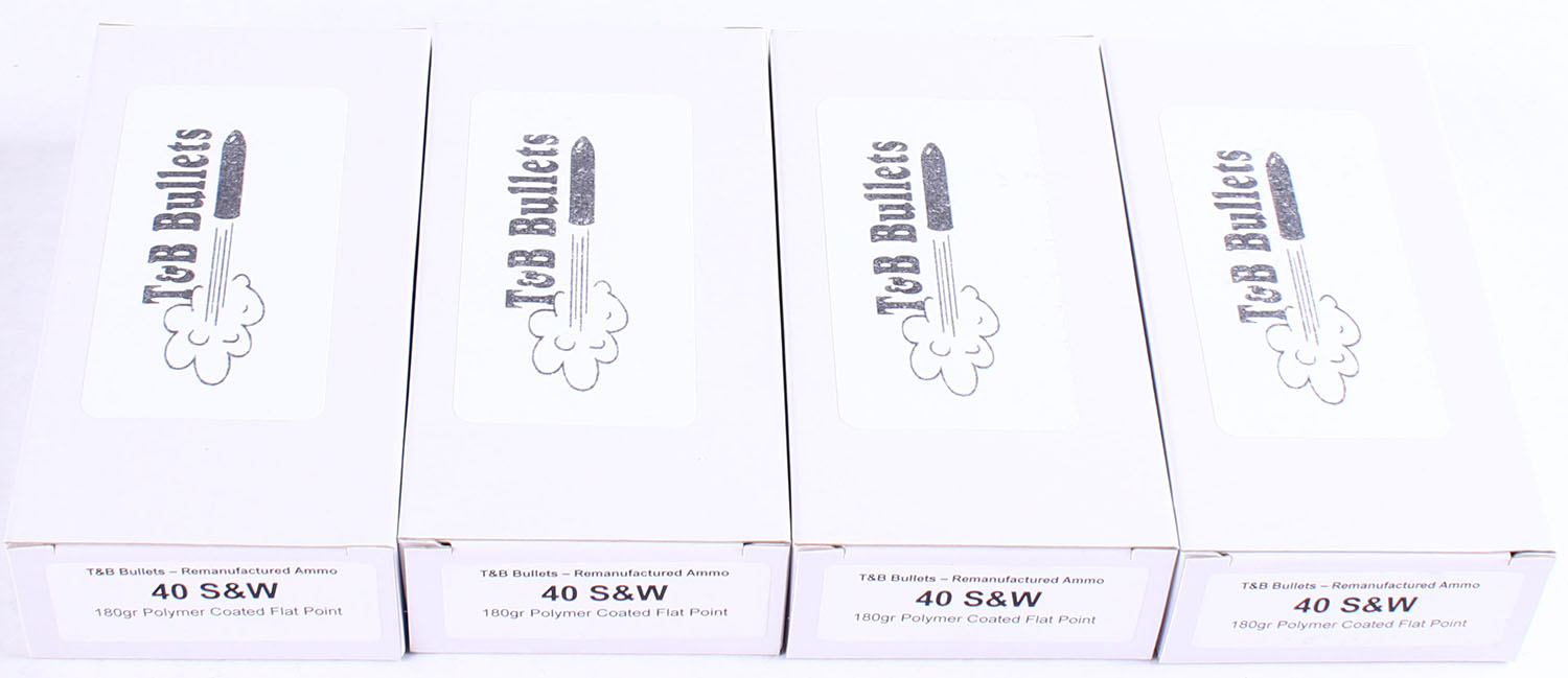 T&B Bullets, Lot of (4) .40 S&W ammo boxes, Remanufactured Ammo by a class type 7 Ammo MFG (this is the same class (high quality) as Winchester, Federal and or CCI), 180 Grain Polymer Coated Flat Point bullet, loaded cartridges, Full, 1pc, white boxes with black print, boxes are very solid, ammo is excellent. Grade: Excellent - Value: 20 to 60