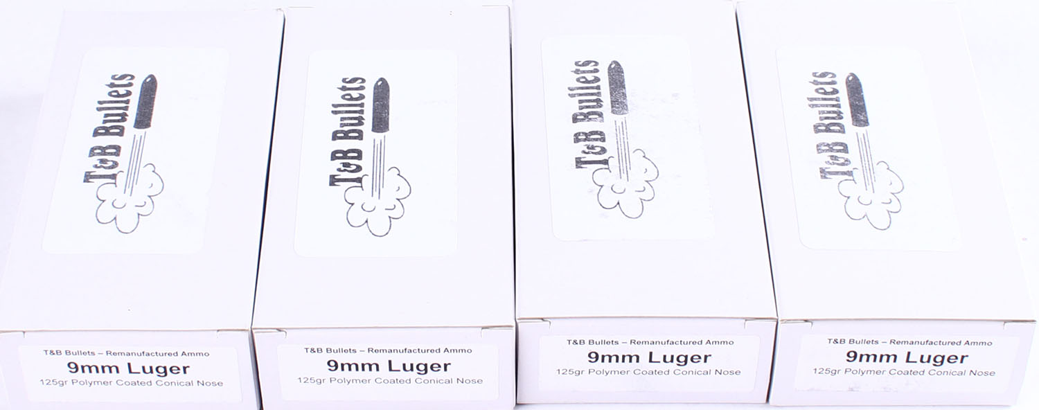 T&B Bullets, Lot of (4), .9mm Luger ammo boxes, Remanufactured Ammo by a class type 7 Ammo MFG (this is the same class (high quality) as Winchester, Federal and or CCI), 125 Grain Polymer Coated Conical Nose bullet, loaded cartridges, 1pc, Full 50 count boxes, white boxes are very solid, ammo is minty. Grade: Excellent ++ - Value: 20 to 100