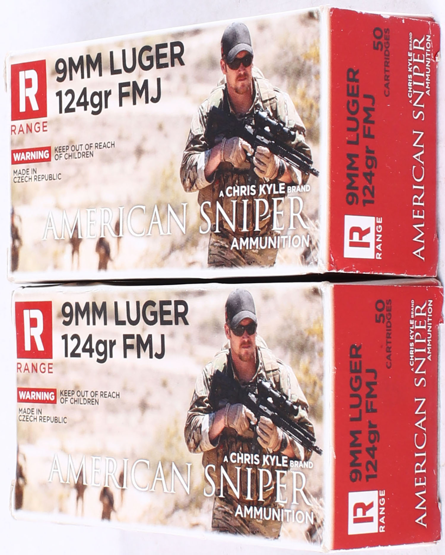 Lot of 2 American Sniper, A Chris Kyle Brand, 9mm., 1pc., Appears Full, 8g/124gr FMJ, multi-colored boxes. Grade: Excellent + - Value: 20 to 40