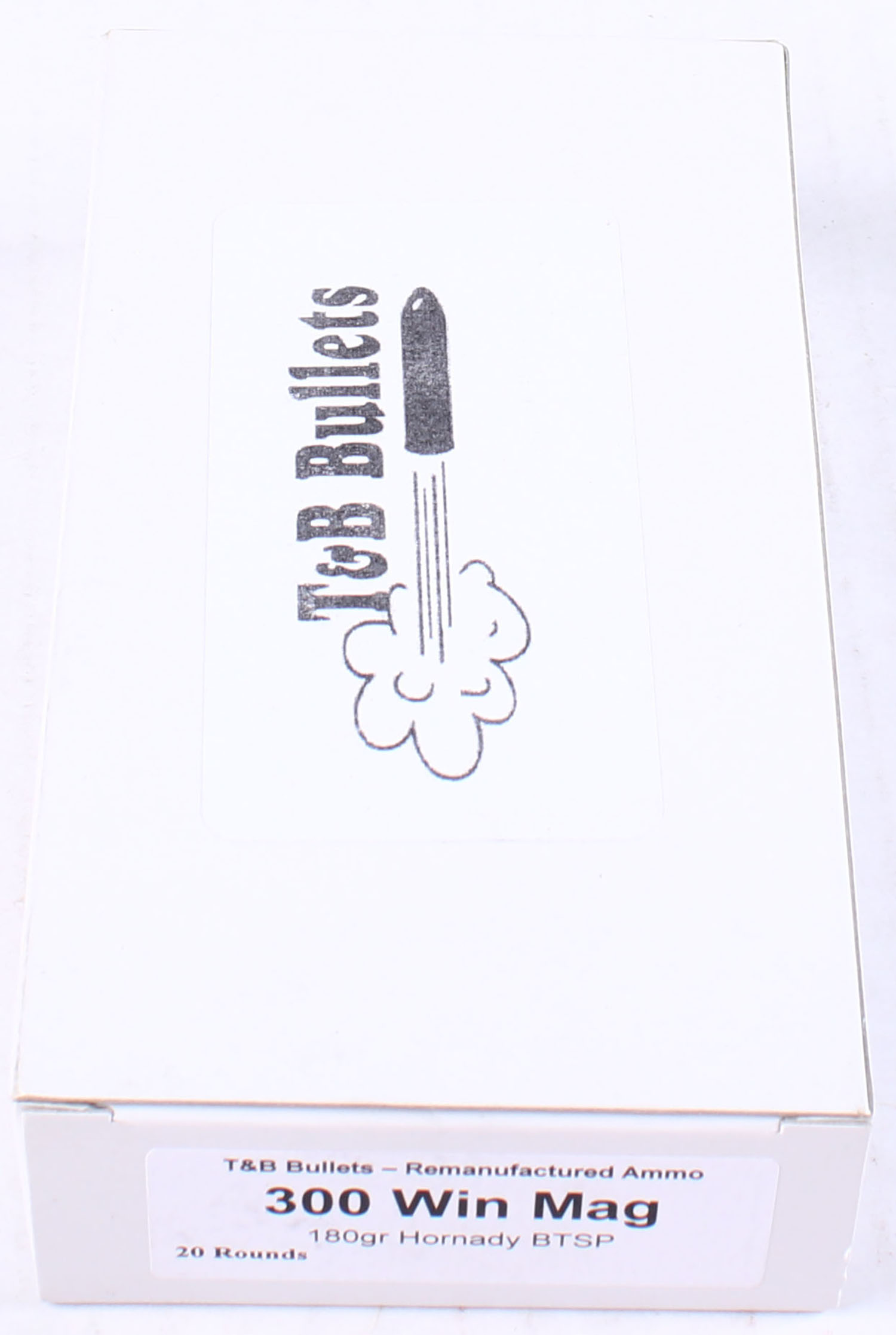 T&B Bullets, .300 Win. Mag ammo box, Remanufactured Ammo by a class type 7 Ammo MFG (this is the same class (high quality) as Winchester, Federal and or CCI), 180 Grain Hornady BTSB bullet, loaded cartridges, Full, 1pc, white box is very solid, ammo is minty. Grade: Excellent ++ - Value: 10 to 50