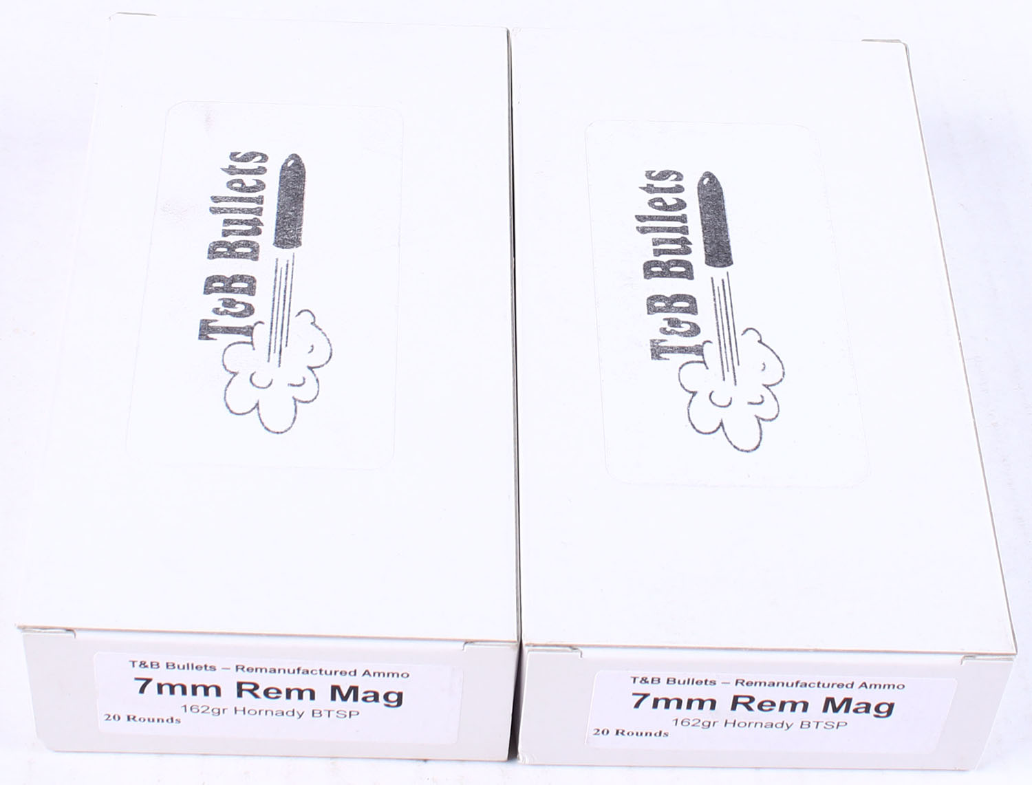 T&B Bullets, Lot of (2), 7mm Rem. Mag ammo boxes, Remanufactured Ammo by a class type 7 Ammo MFG (this is the same class (high quality) as Winchester, Federal and or CCI), 162 Grain Hornady BTSP bullet, loaded cartridges, Full, 1pc, white boxes are very solid, ammo is minty. Grade: Excellent ++ - Value: 10 to 60