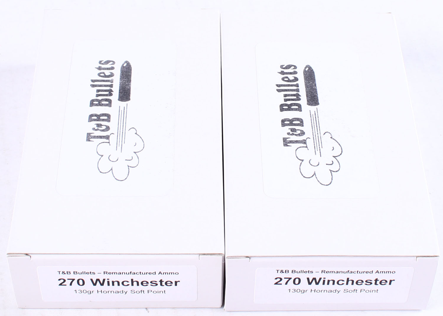 T&B Bullets, Lot of (2), .270 Winchester ammo boxes, Remanufactured Ammo by a class type 7 Ammo MFG (this is the same class (high quality) as Winchester, Federal and or CCI), 130 Grain Hornady soft point bullet, loaded cartridges, Full, 1pc, white boxes are very solid, ammo is minty. Grade: Excellent ++ - Value: 10 to 60