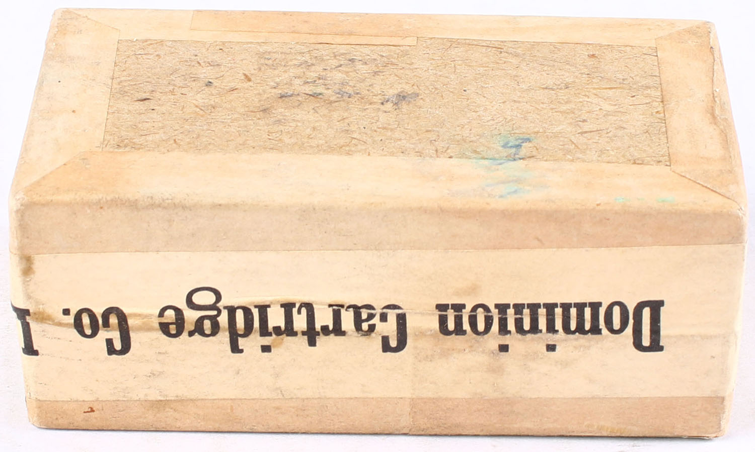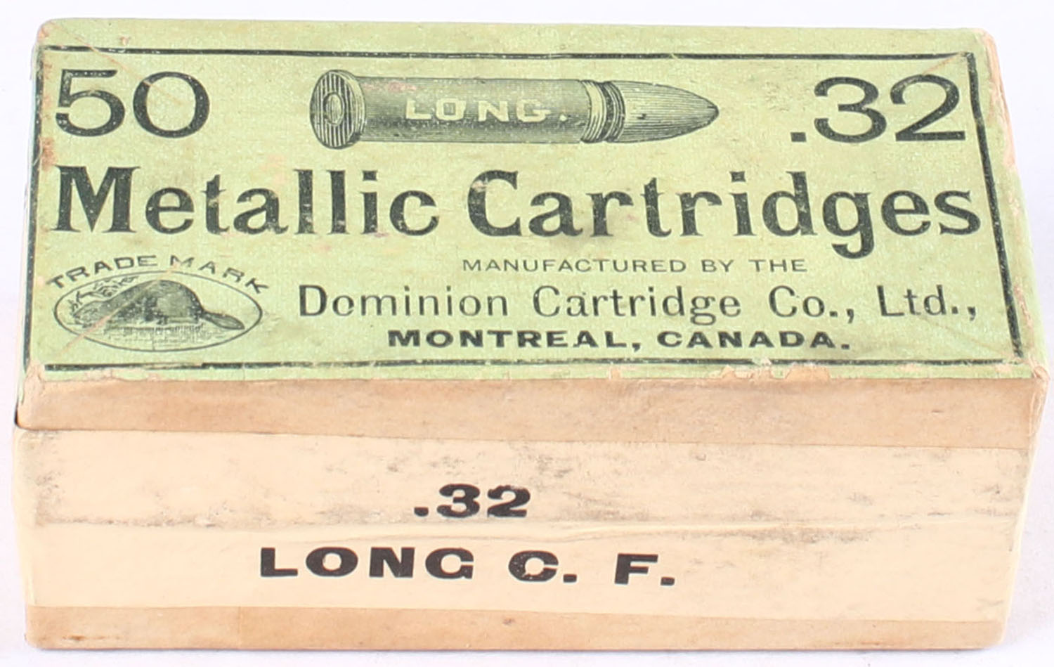 Dominion Cartridge Co., Metallic Cartridges, .32 Long C.F., Full & Sealed, 2pc, buff box with green and black label, box is very clean with minor wear, light fading to top label. Grade: Very Good ++ - Value: 40 to 150