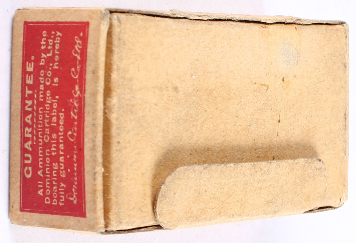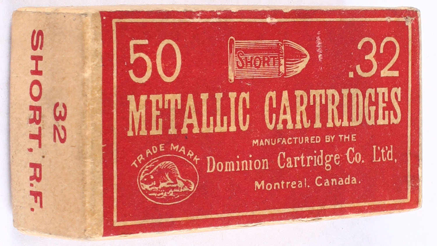 Dominion Cartridge Co., 32 Short, Metallic Cartridges, Full, 2pc, buff box with red and buff label, box is very clean with minor wear, ammo is poor.. Grade: Very Good ++ - Value: 20 to 80
