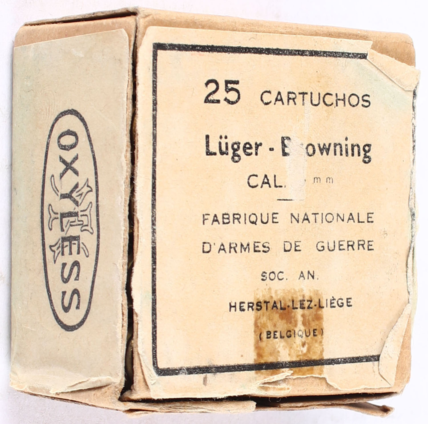 Fabrique Nationale D'Armes de Guerre, 9mm Luger, Full, 1pc, Buff box with buff & black label, box has age soiling & scuffing, ammo is very good. Grade: Good ++ - Value: 14 to 21