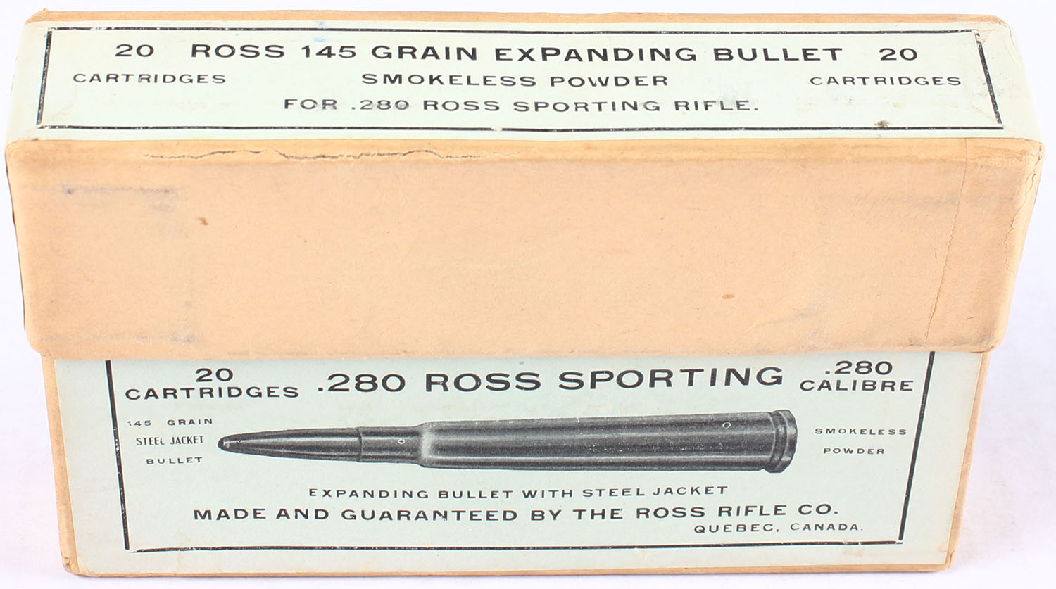 Ross Rifle Co., .280 Ross Sporting, 145 Grain Expanding Steel Jacket, smokeless, FULL & SEALED, 2pc., buff box with green label, box is very solid with minor shelf wear. Grade: Excellent + - Value: 50 to 200