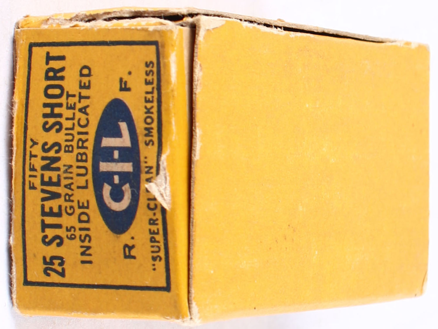 CIL, Super Clean, .25 Stevens Short, Rim Fire, 65 Gr. Bullet, 1pc, Full, yellow box with blue label & blue print, box is solid with light rub wear, has a partial seam split, ammo is Excellent. Grade: Very Good - Value: 20 to 80