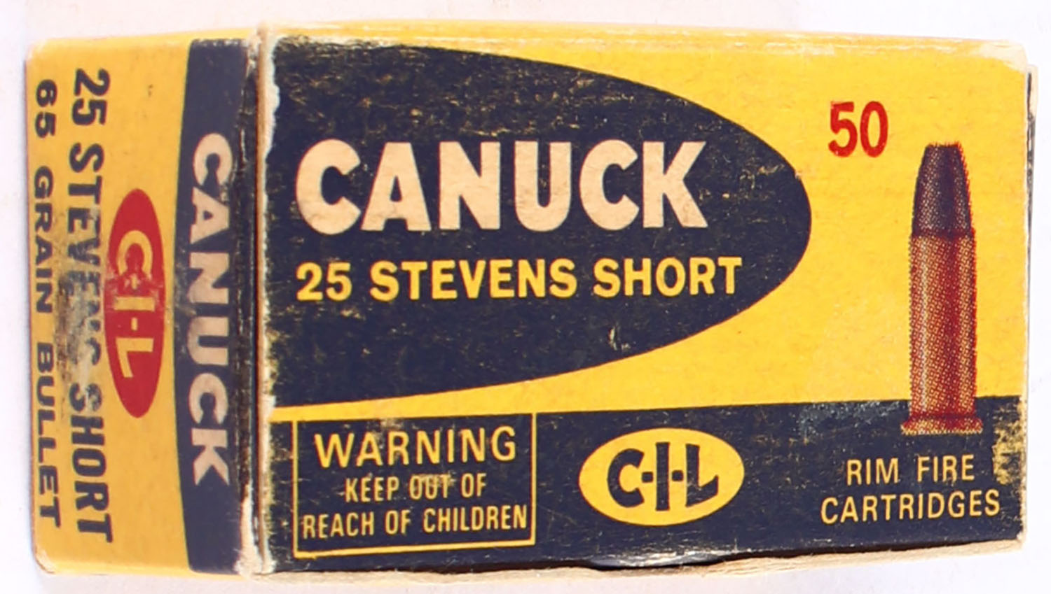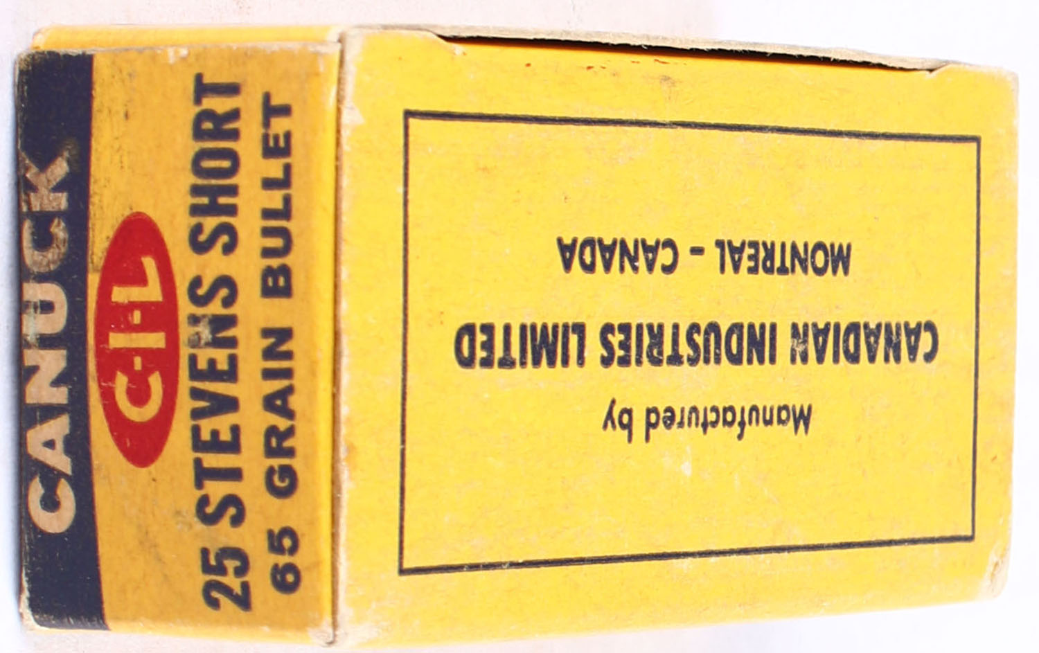 C-I-L, Canuck, 25 Stevens Short, 65 Grain, Full, 1pc. Multi-colored box, box has minor scuffing, ammo is excellent. Grade: Excellent - Value: 80 to 120