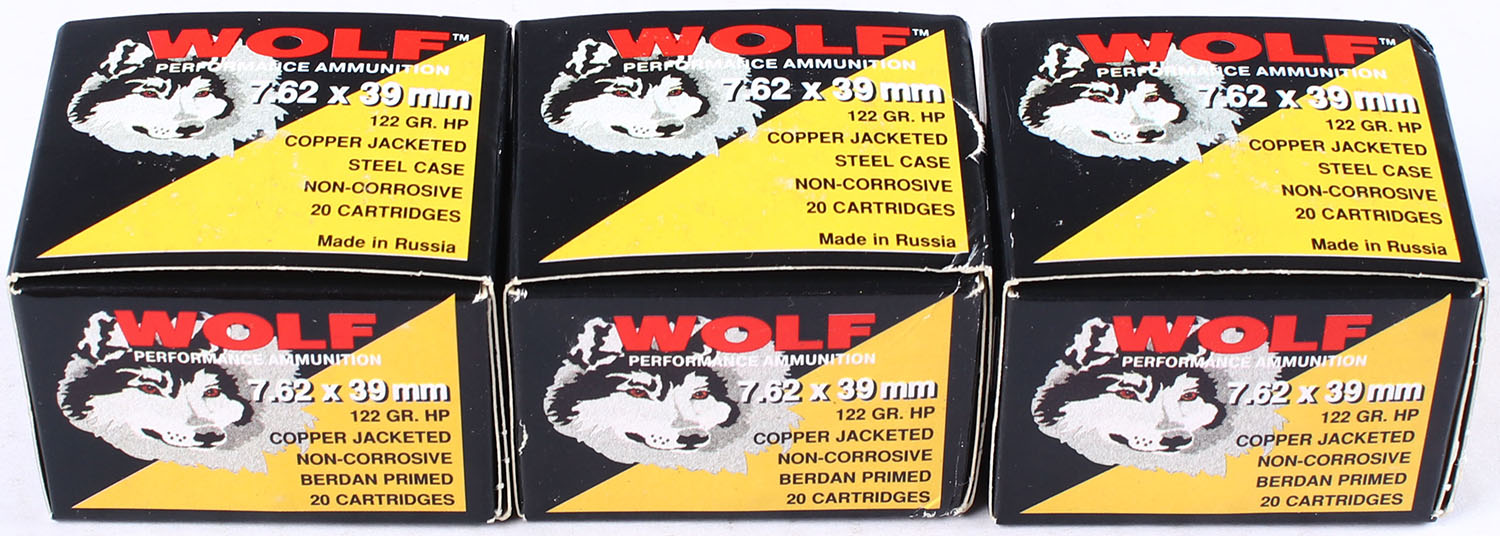 Wolf, Lot of (3), 7.62x39mm, 122 Grain Copper Jacketed Steel Case, Full (60rds), 1pc, multi-colored boxes, boxes are solid, ammo is minty. Grade: Excellent - Value: 20 to 30