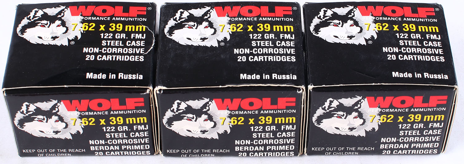 Wolf, Lot of (3), 7.62x39mm, 122 Grain FMJ Steel Case, Full (60rds), 1pc, multi-colored boxes, boxes are solid, ammo is minty. Grade: Excellent - Value: 20 to 30