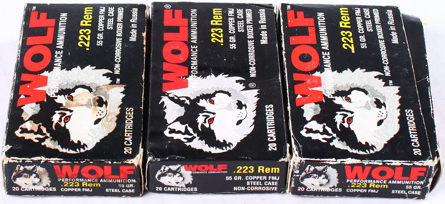 Wolf, Lot of (3) .223 Rem, 55 Grain Copper FMJ, Full, 1pc., Multi-colored boxes, boxes have corner wear, Ammo is excellent. Grade: Very Good ++ - Value: 20 to 30