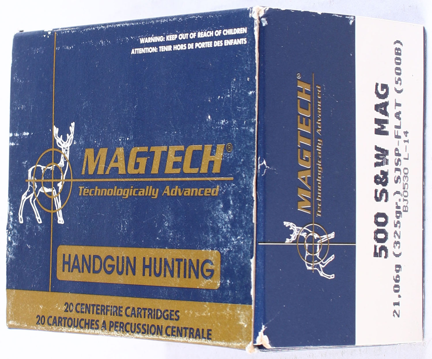 Magtech, .500 Smith & Wesson Mag, 325 Grain, SJSP Flat, Full, 1pc, Blue & gold box, box has minor scuffing, ammo is excellent. Grade: Excellent ++ - Value: 50 to 80