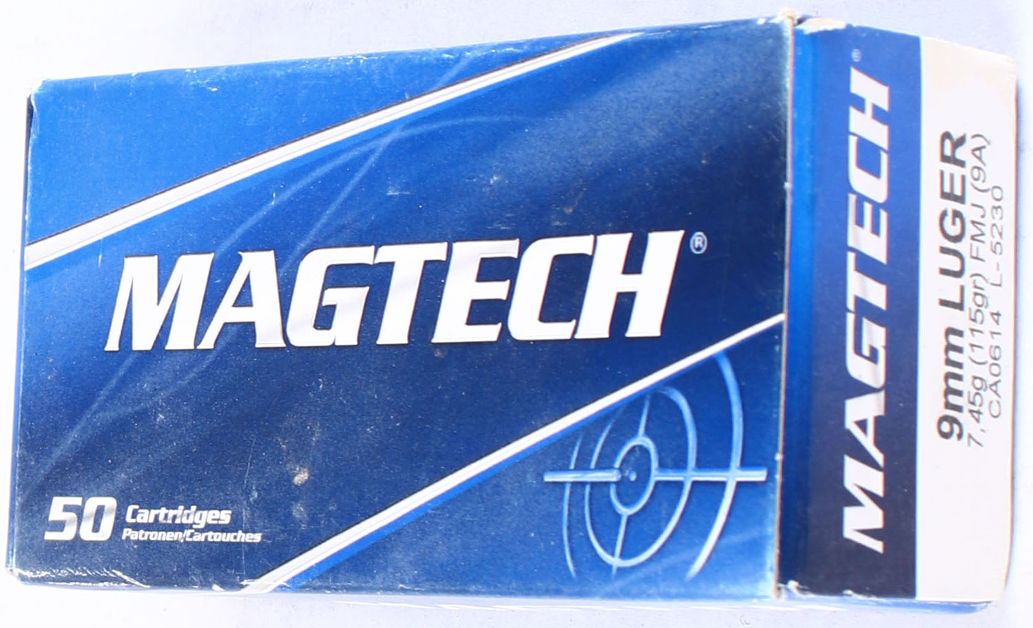Magtech, 9mm Luger, 115 Grain FMJ, Full, 1pc., Multi-colored box, box is solid, ammo is excellent. Grade: Excellent - Value: 14 to 21