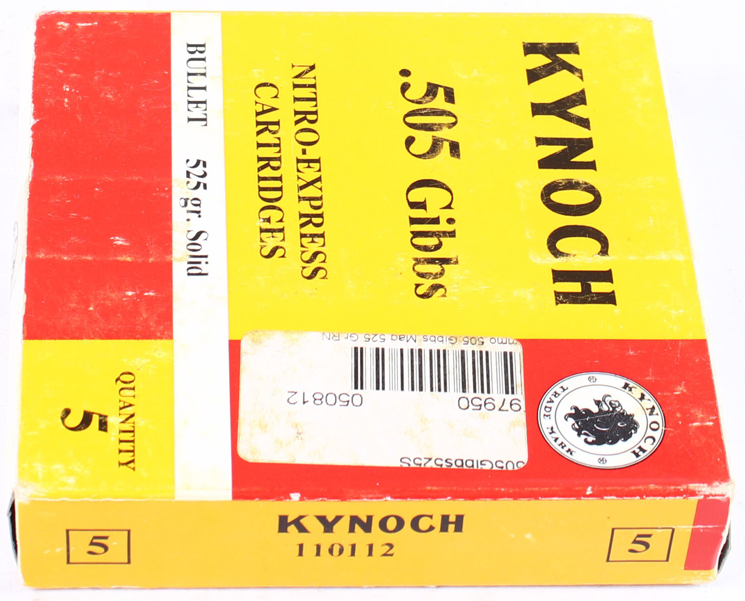 Kynoch, Nitro-Express, .505 Gibbs, 525 Grain Solid, FULL & SEALED, 1pc., Multi-colored box, box is solid with excellent color. Grade: Excellent - Value: 80 to 120