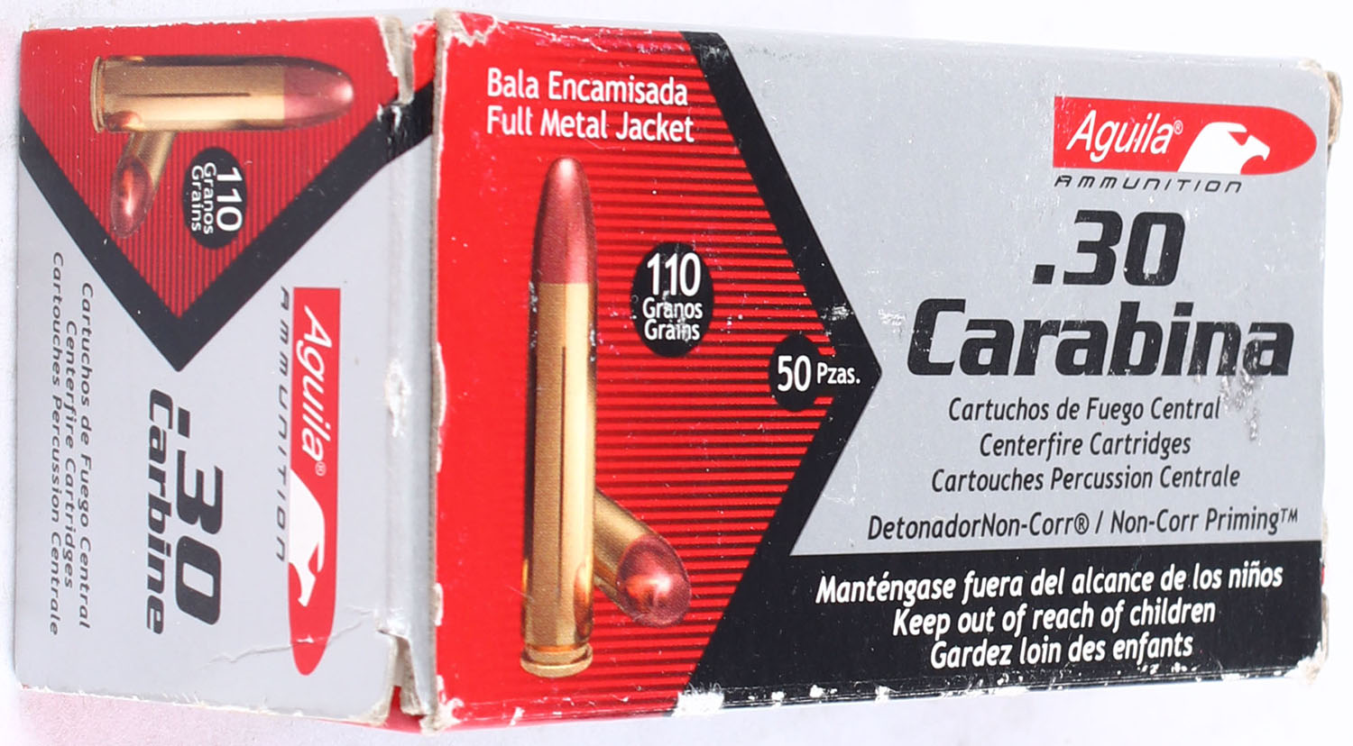 Aguila, .30 Carbine, 110 Grain, Full, 1pc., Multi-colored box, box has edge & corner wear with shelf wear, ammo is mint. Grade: Very Good - Value: 24 to 36
