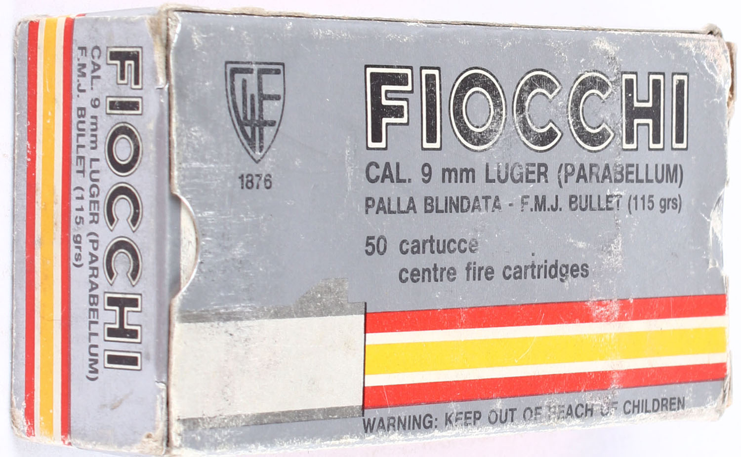 Fiocchi, 9mm Luger (Parabellum), 115 Grain FMJ, Partial 40rds., 1pc., Multi-colored box, box has age soiling with edge & corner wear, ammo is excellent. Grade: Good ++ - Value: 14 to 21