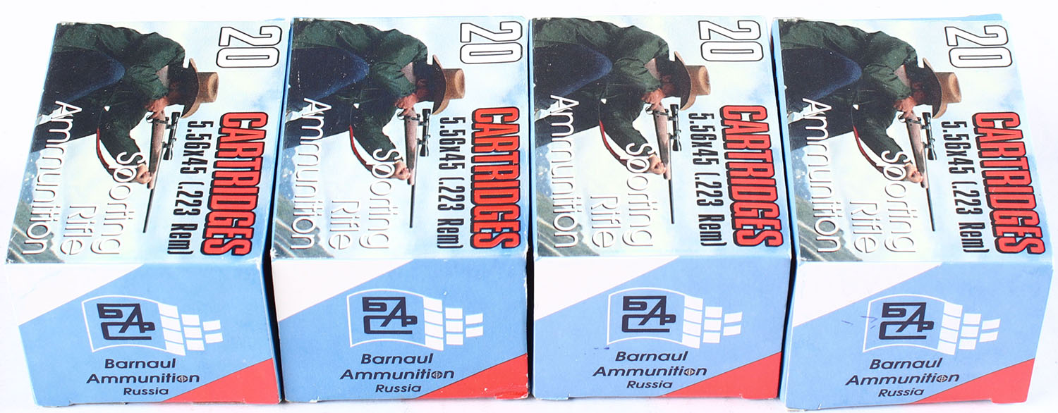 Barnaul Ammunition, Lot of (4), .223 Rem., 62 Grain FMJ BT., Full, 1pc, Multi-colored boxes, boxes are very solid, ammo is sealed in paper. Grade: Excellent ++ - Value: 20 to 30