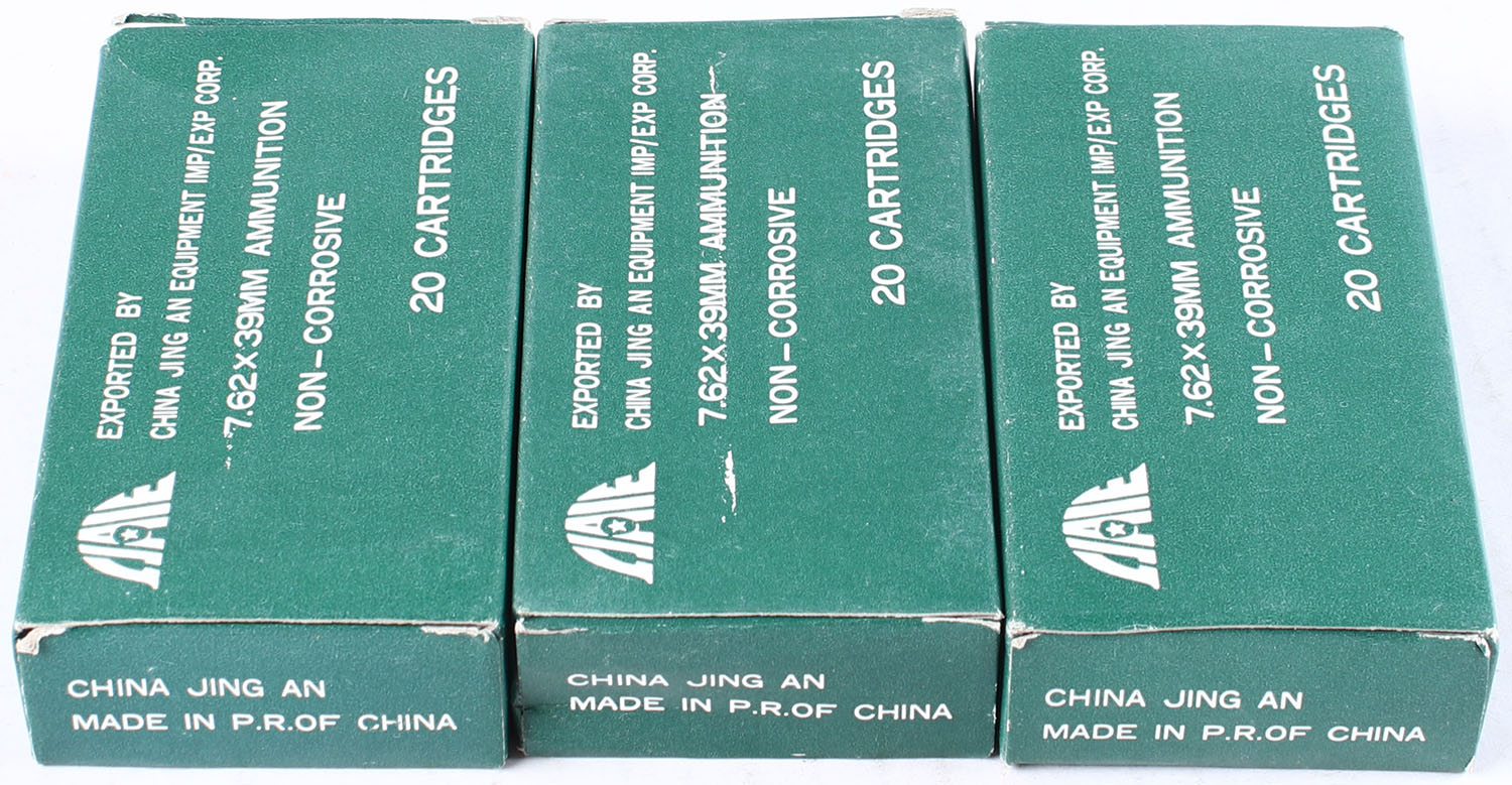 China Jing, Lot of (3), 7.62 x 39mm, Full, 1pc. Green boxes, boxes are solid with excellent color, ammo is minty. Grade: Excellent + - Value: 24 to 36