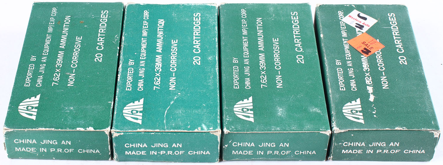 China Jing, Lot of (4), 7.62 x 39mm, Full, 1pc. Green boxes, boxes are solid with excellent color, ammo is minty. Grade: Excellent + - Value: 30 to 40