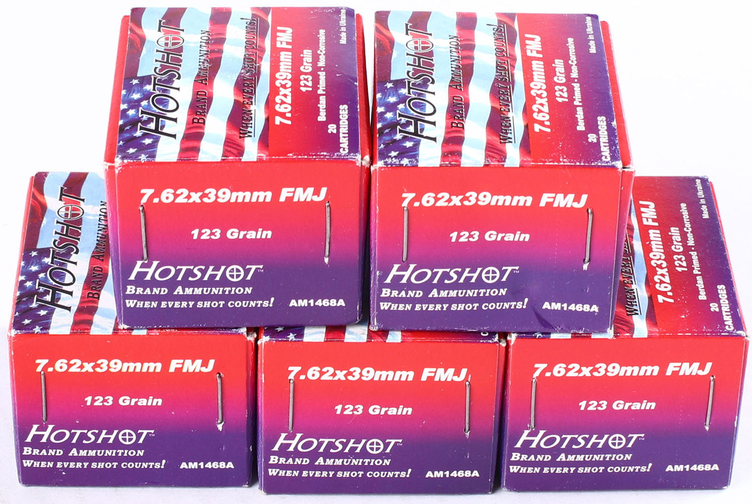 Hotshot, Lot of (5), 7.62 x 39mm FMJ, 123 Grain, Full, 1pc., Multi-colored boxes, boxes are very solid with excellent color, ammo is excellent. Grade: Excellent + - Value: 30 to 40