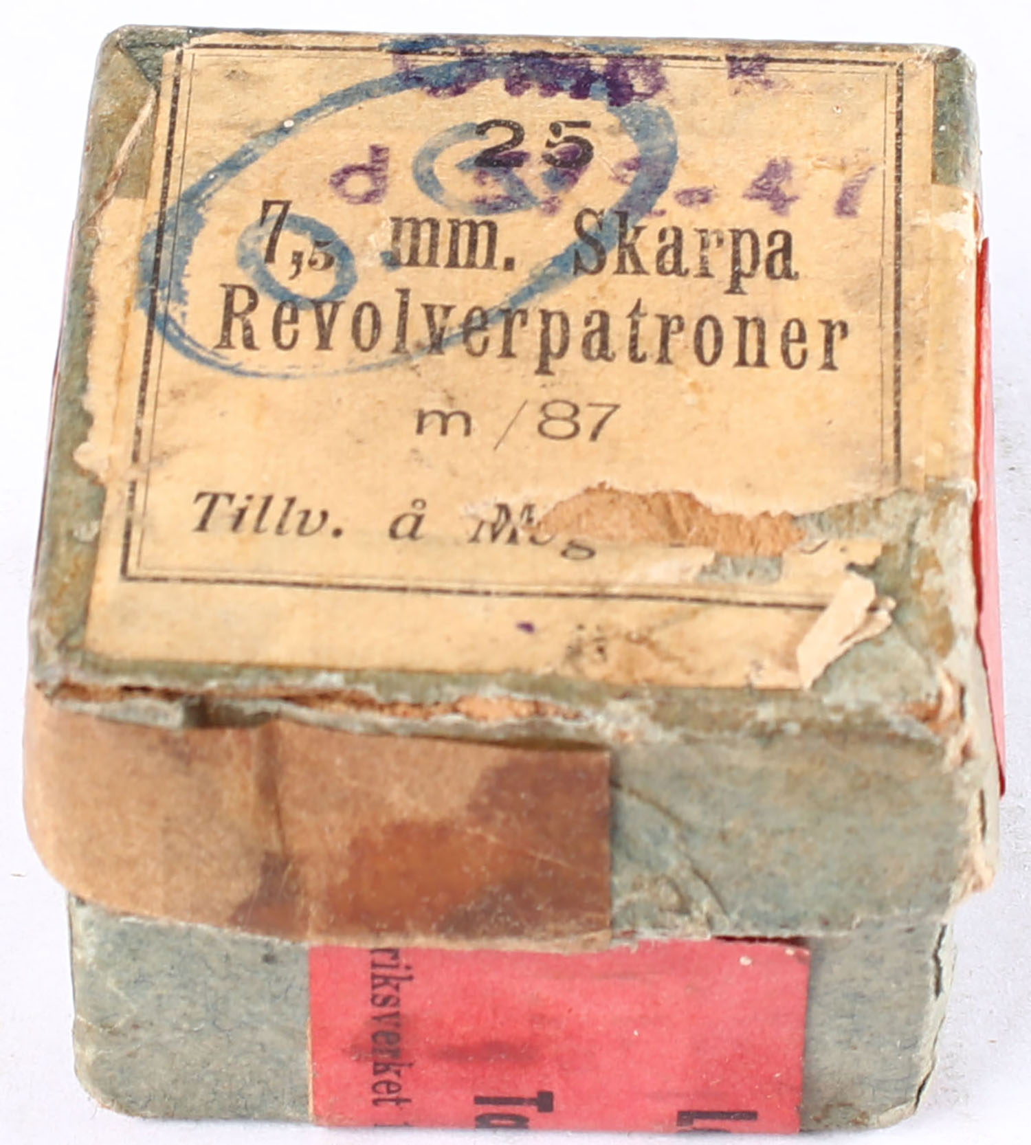 Skarpa Revolverpatroner, ''Sharp Revolver Cartridges'', 7.5mm, Full, 2pc., Buff box with red sealing label, box has age soiling with scuffing, ammo is good. Grade: Good - Value: 16 to 40