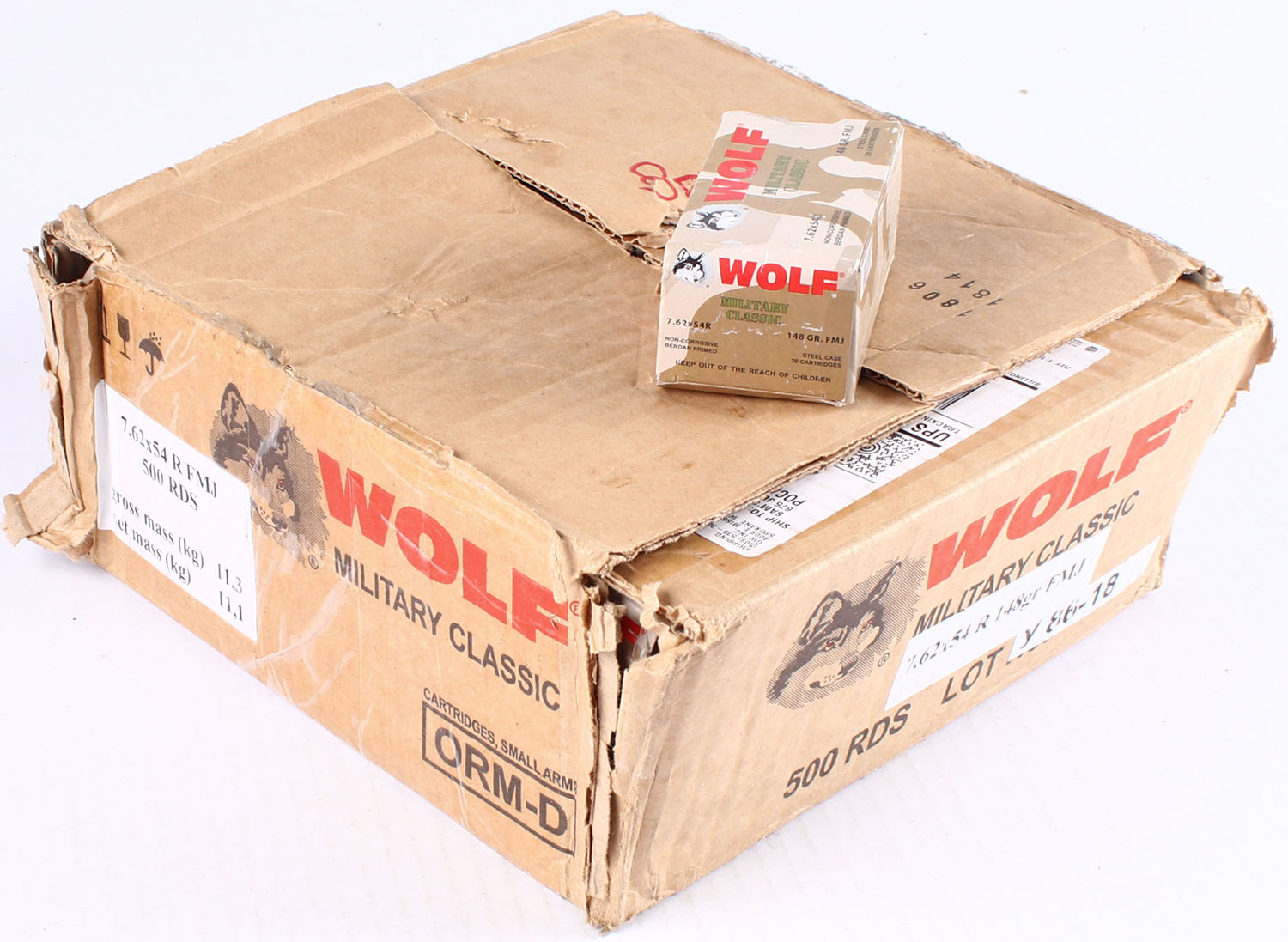 WOLF, Military Classic, 7.62 x 54R, 148 Grain FMJ, FULL Case, 500Rds., (25 Boxes). Boxes have corner wear with rub marks, ammo is sealed in paper wrap. Grade: Very Good ++ - Value: 100 to 400
