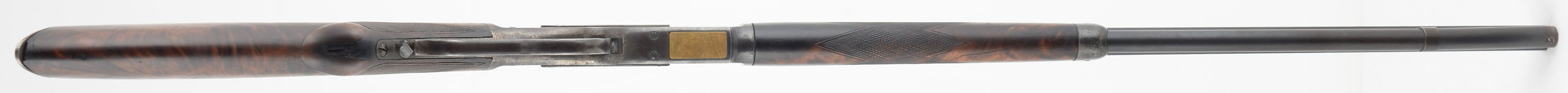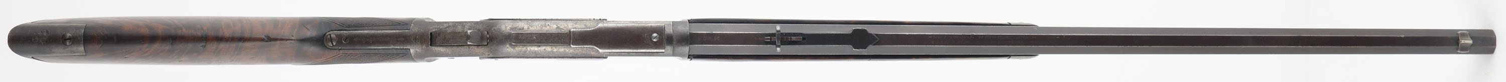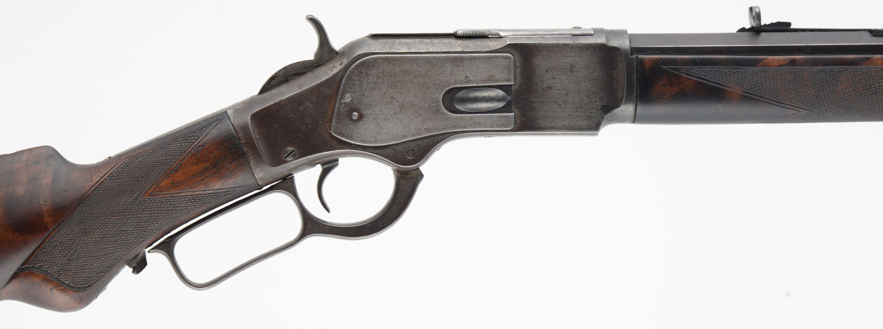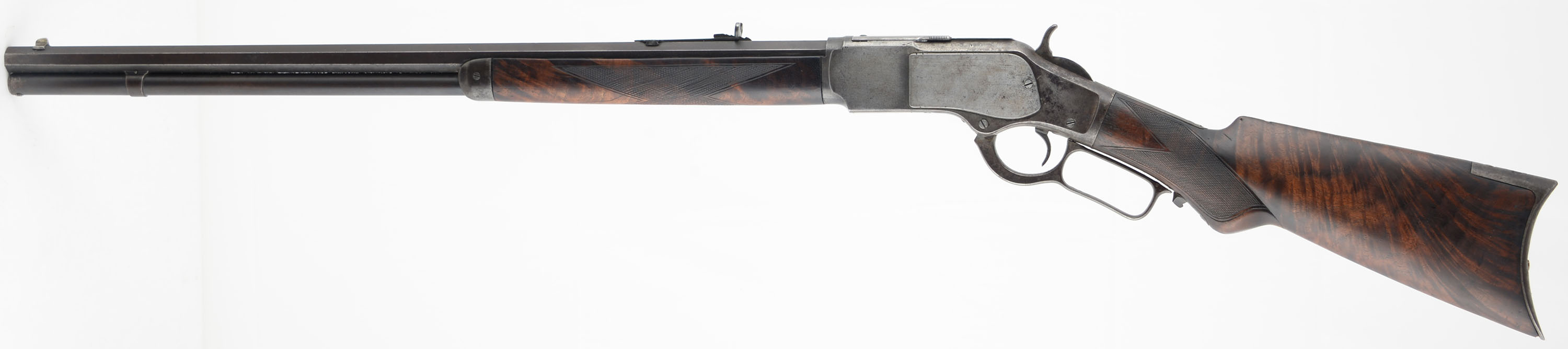 FANTASTIC Winchester Model 1873 Deluxe, 38 WCF CAL., MFG: 1895, SN: 496970, Lever Action Rifle, 24 1/4'' Octagon barrel, Full Mag. The factory deluxe, checkered, flat pistol grip wood stocks are excellent. Having been cleaned, lightly sanded & reoiled. The stocks have a few light scratches & contusions remaining & there is a 1'' grain stress crack in the middle of the right side of the forend. There is some missing edge chipping at the toe. The stocks have fantastic feathered & rippled contrasting grain. The pistol grip displays an ebony insert. The metal blue finish on the barrel & mag have toned mostly to a brown patina, with remnants of original blue in protected areas between barrel & mag. The case-hammered receiver, lever & hammer have some smokey outlines of faded case-colors, but have mostly faded or worn gun metal gray, with a thin brown patina. Bore is good, but with cleaned roughness amongst solid rifling. The barrel holds an adjustable rear & silver pinched blade front sights. Buttstock carries a sliding trapdoor crescent metal buttplate. Plain trigger. A beautiful, deluxe 1873 rifle which presents well. Antique, NO FFL Req. - Value: 5000 to 6500
