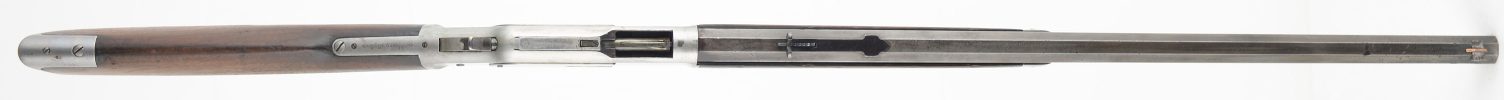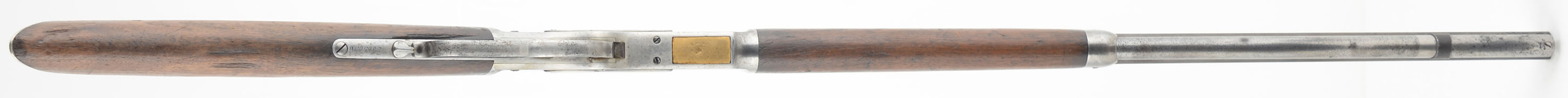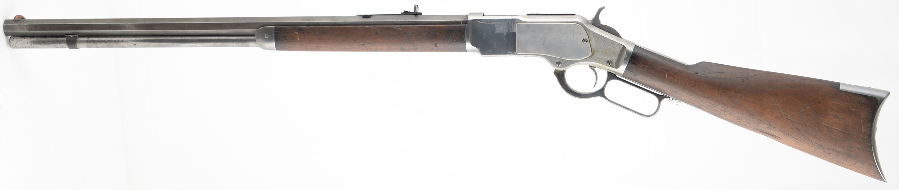 Winchester, Model 1873, 3rd Variation, Marked .44 W.C.F. Cal., MFG: 1888, SN: 286503B, Lever Action Rifle, 24'' Octagon barrel, Full mag. The original straight grip wood stock & forend are good & solid, with numerous scratches, scrapes, gouges & contusions to the wood & original worn thin finish. There is a thin missing sliver of wood missing from the lower right edge at the wrist & glued 6'' crack on the right side of the forend. The metal blue finish has worn & been polished away leaving most areas in the white, with some thin brown patina on the barrel. There is cleaned pitting on the barrel & mag tube. Mag tube retention loop is loose in the dovetail. The loading gate retains some original blued finish. Bore is fair, with lots of cleaned roughness amongst thinning rifling. The barrel holds an adjustable rear sight & blade front sight, with the blade being replaced with a homemade copper blade. Stock carries a sliding trapdoor smooth crescent metal buttplate. Dust cover is missing. Tight action. A solid antique 1873 rifle that in my opinion is a candidate & would benefit from some restoration. Great project rifle, at an affordable value spread. Antique, No FFL Req. - Value: 800 to 1500