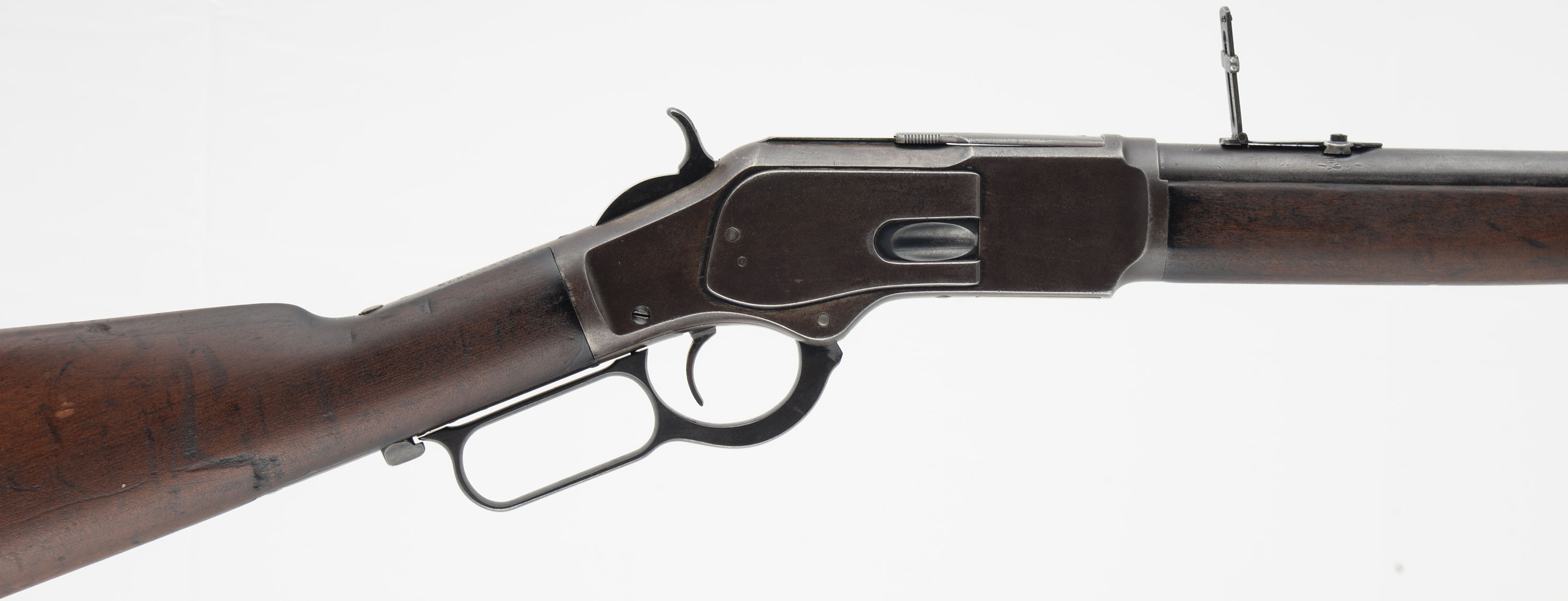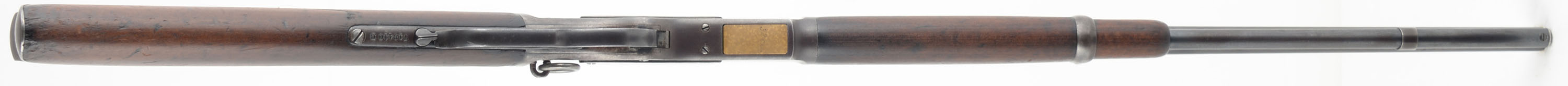 Winchester, Model 1873 Saddle Ring Carbine, 3rd model, .32 WCF Cal., MFG: 1917, SN: 718410B, Lever Action Carbine, 20'' Round barrel, Full mag. The original wood stocks are very good & solid. The wood has a nice aged or darkened rich chocolate brown appearance, with several minor to small scratches, gouges & contusions to the wood & original finish. The original metal blue finish has worn & toned to an even thinning brown patina, with remnants of original blue on the protected areas between barrel & mag. Fitted with a flip-up ladder rear & box carbine front sights. Bore is good, with some cleaned roughness amongst strong rifling. Metal carbine buttplate. Original saddle ring. Tight smooth action. A very nice, original & desirable Model 1873 SRC in the rarer 32 WCF. FFL or C&R Req. - Value: 3000 to 4500