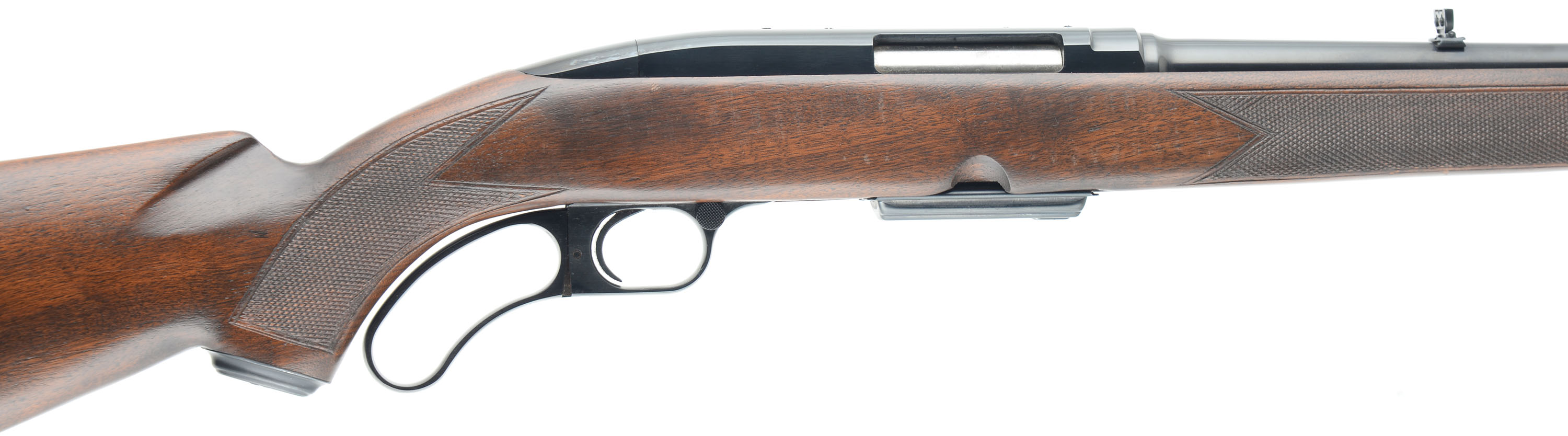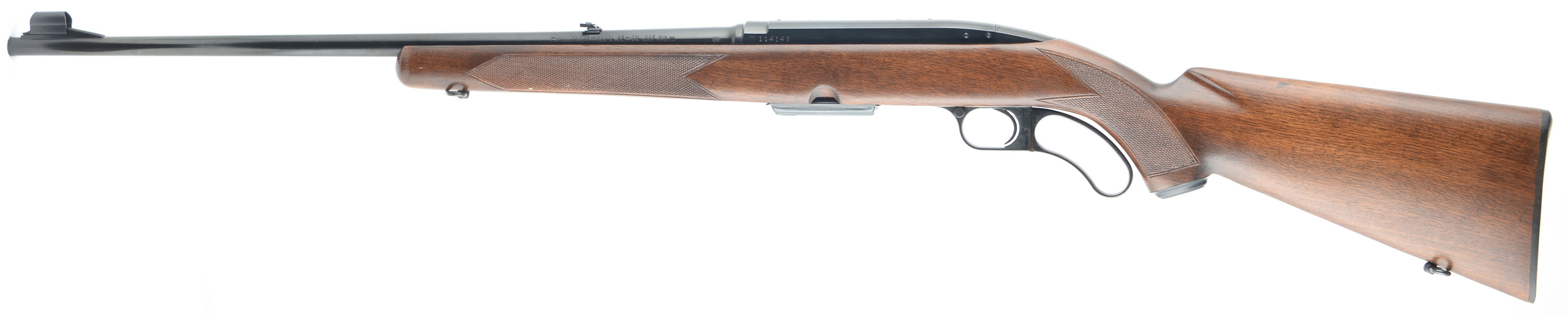 BOXED Winchester, Model 88, marked Cal. 308 WIN, MFG. 1961, SN: 114149, Lever Action Rifle, 22'' Round barrel, Pre-64, The checkered & capped pistol grip wood stock is original & excellent. This example has the early diamond cut checkering. There are some very minor finish level scrapes & scuffs, to the excellent original finish. The original metal blue finish is 99% overall. Bore is excellent. The barrel carries a folding rear sight & hooded ramp front sight. The stock carries the original checkered plastic buttplate. Sling swivels. The rifle comes in a correct period factory box, with a couple of original hang tags & brochures. A very nice original condition example, which is very collectible. FFL or C&R Req. - Value: 2000 to 3000