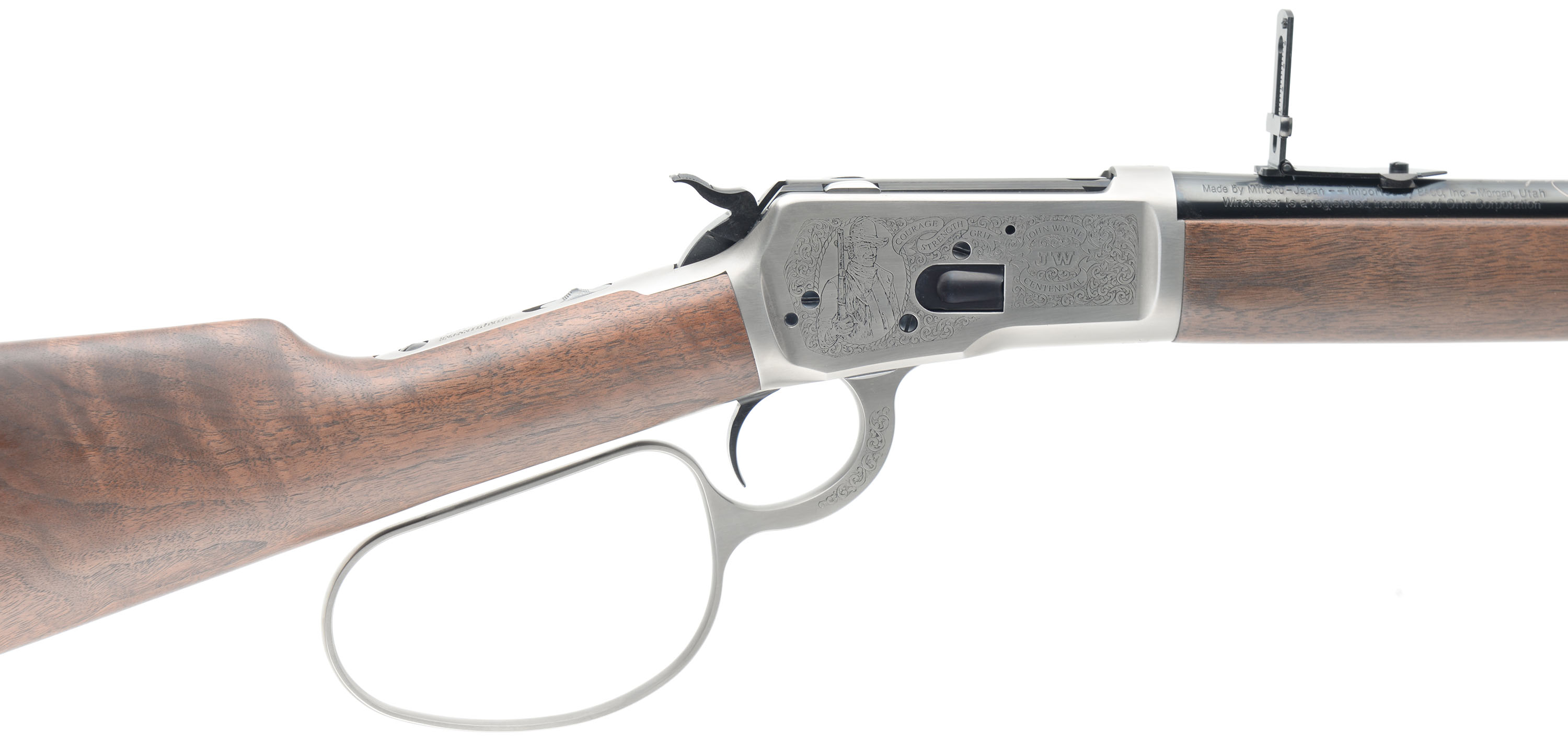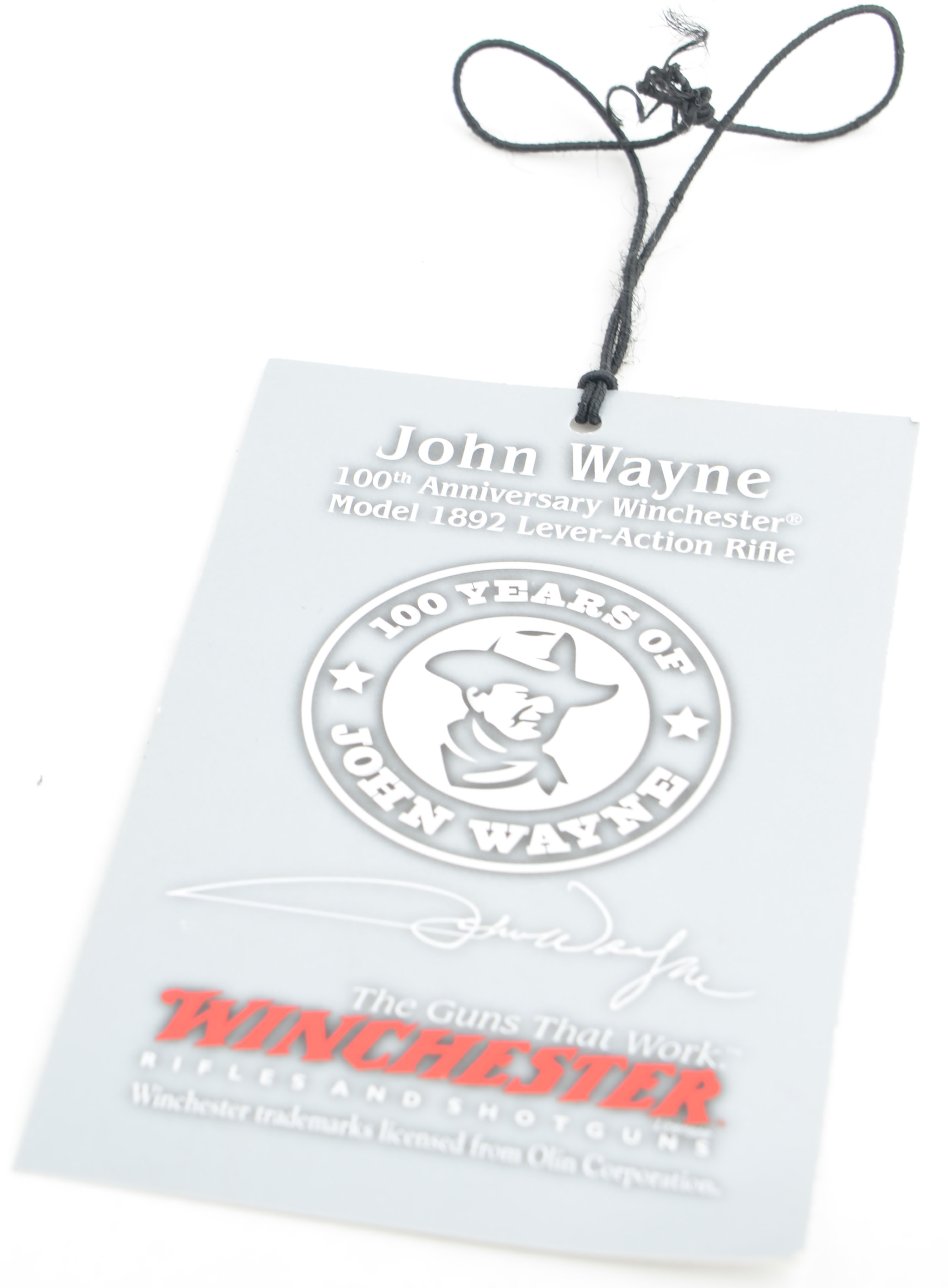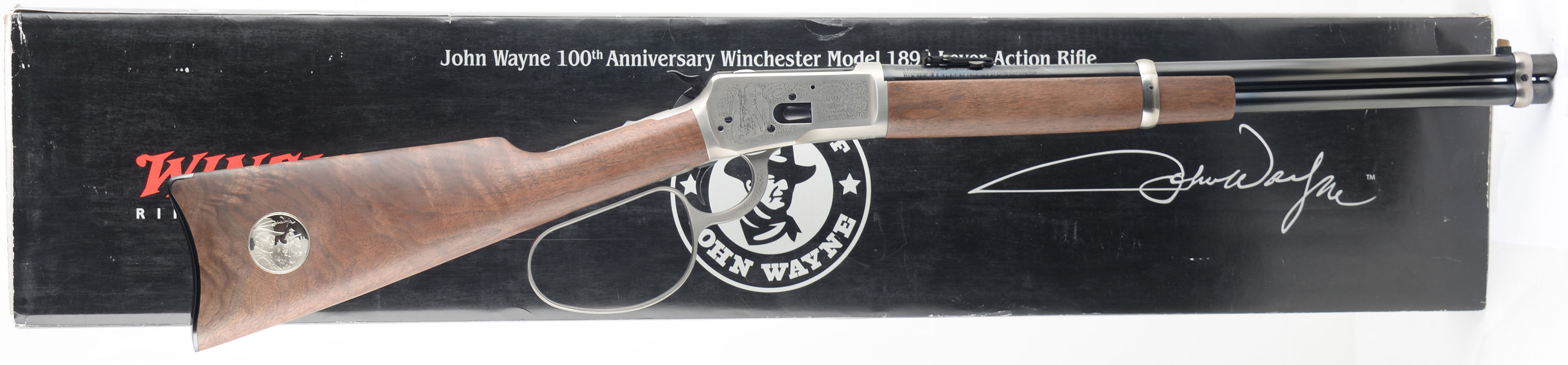 BOXED Winchester, Model John Wayne 100th Anniversary Custom Grade 1892 SRC, marked Cal. 44-40 WIN, MFG. 2007, SN: JW100H3460, Lever Action Rifle, 18 1/2'' Round barrel, Pre-64, The High Grade is a limited edition of only 4,000 rifles, each highly embellished with delicate scroll engraving & fond reminders of Duke. It celebrates the 100 year anniversary of his birth. The right side of the scroll engraved silver nickel nitride receiver features John Waynes portrait, his initials & a flowing banner with the words ''Courage, Strength, Grit.'' Left side of the scroll engraved silver nickel nitride receiver displays two portraits of John Wayne, along with a banner that reads ''John Wayne American, 1907-2007'', all richly accented by a deeply blued saddle ring, trigger & hammer. John Wayne's silvered signature graces the short 18 1/2'' barrel. The ladder style carbine rear sight is fully adjustable. Two silver nickel nitride barrel bands match the receiver. The deeply blued loading gate & action screws lend an extra touch of elegance. The straight black walnut stocks are original & excellent. The right side of stock carries a silver medallion with Duke images. The original metal finishes rate 100% overall. Bore is excellent. The barrel carries a rear carbine ladder sight & brass front blade. The large loop lever is designed for fast action. The stock carries the original carbine style buttplate. Original saddle ring & staple. Comes in the original factory box, with outer sleave, lock, hang tag & paperwork. An excellent, original condition special commemorative rifle. FFL or C&R Req. - Value: 1800 to 2500